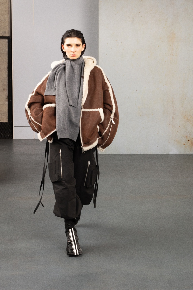 The collection also showcases a neutral color palette, with new tones such as cognac, burnt brown, and dark grey melange. The fabrics and materials used are super light and high-quality, such as matte nylon, fustian, mohair-like wool, hand-operated cashmere pashmina, and cupro silk. Sheepskin and leather are also prominent, in natural dark brown hues, while exclusive fabrics, such as raw wool jacquard, display intricate patterns on a loom.
