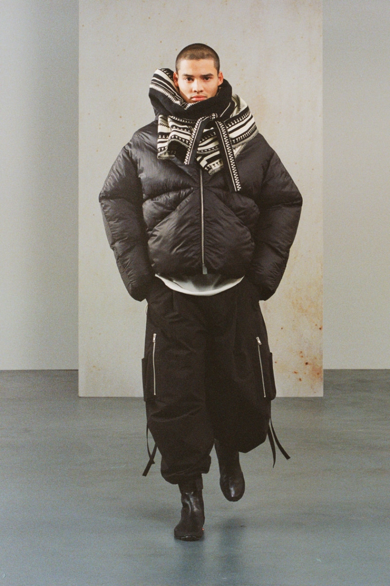 “Flight Techniques” is a collection that emphasizes a fundamental and defined style, inspired by menswear staples and martial arts attire. The garments are designed to be light and precise, with a distinct silhouette-driven approach. The shapes are loose yet controlled, featuring round and substantial shoulders and pants with deep folds opening below the waist and tapering at the ankle.