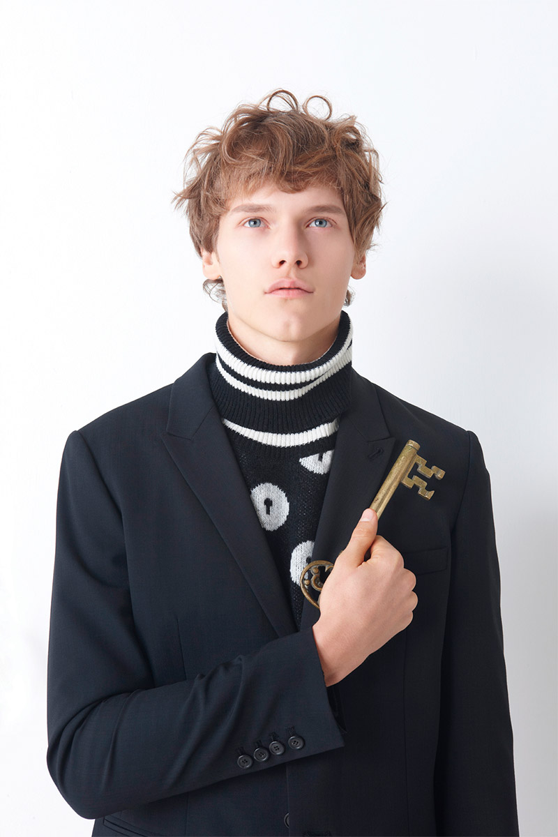 The three buttoned coat and collarless jackets are made of soft alpaca and brushed wool. Oversized coat is finished with chalk stripes brushing, and heavy jackets are lined with hound-tooth pattern. For all the outers, embroidery key is hidden and placed on the clothes to represent the key to hope. Different types of plaids, such as tartan and buffalo checks, and polka dotted patterns were used in the shirts group. Brushed span fabric is used in asymmetric slim pants and cargo pants for functionality and extra warmth, and laminating sweat suits are added in the cut and saw category. Lastly, MUNSOO KWON’s popular group of knits consist of different styles of sweaters and cardigans with jacquard details inspired by the coherent theme, key of hope.