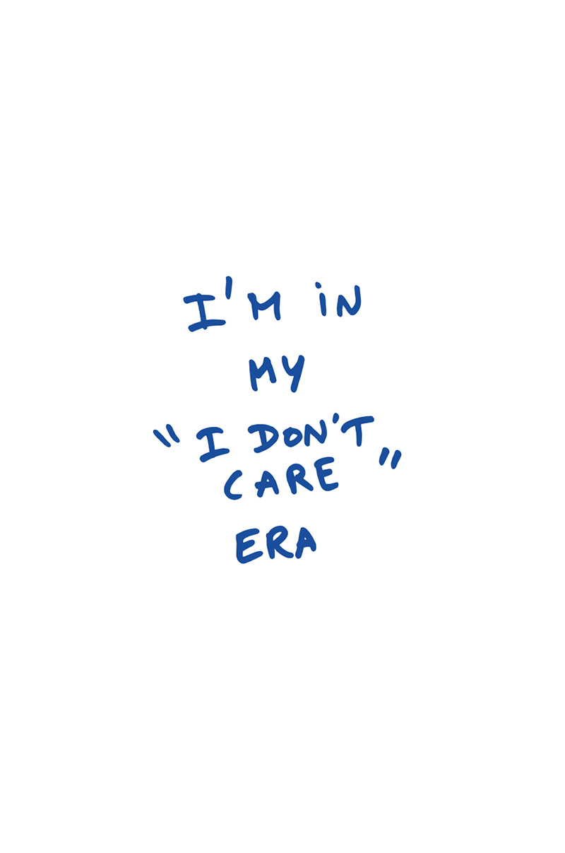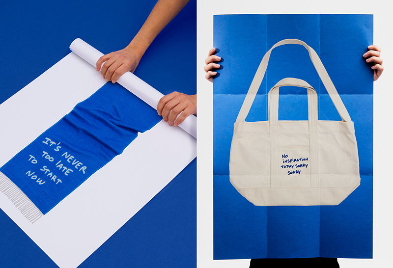 The new edition introduces five items: a phone case, a cap, a scarf, a beanie, and a tote bag. The phone case features Lélu’s recognizable blue typography on a mirrored background. The cap, in a washed blue tone, carries a white graphic that defines the collection’s look. The tote bag is a minimalist canvas piece, with a message in blue letters that adds the artist’s characteristic humor.