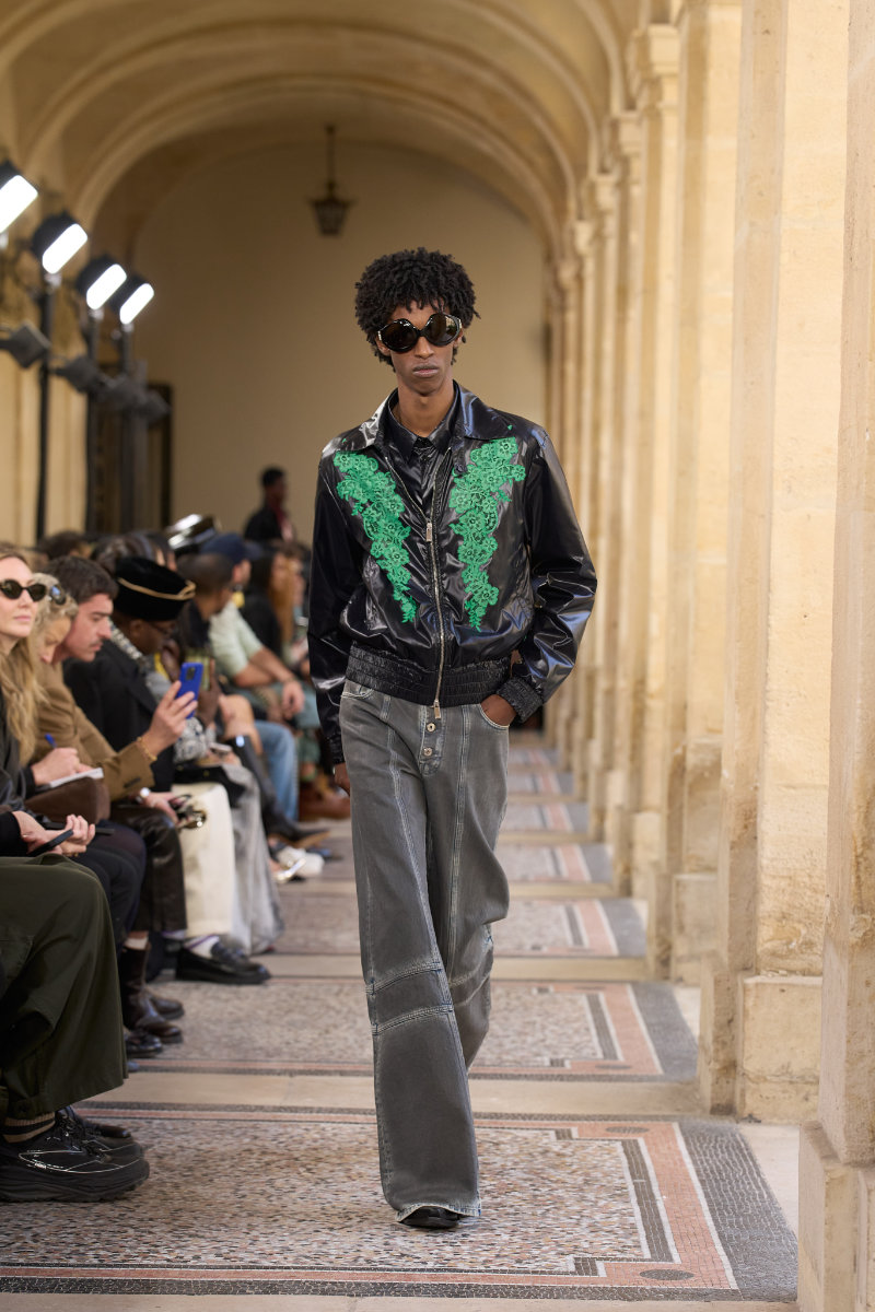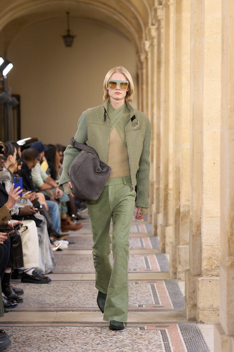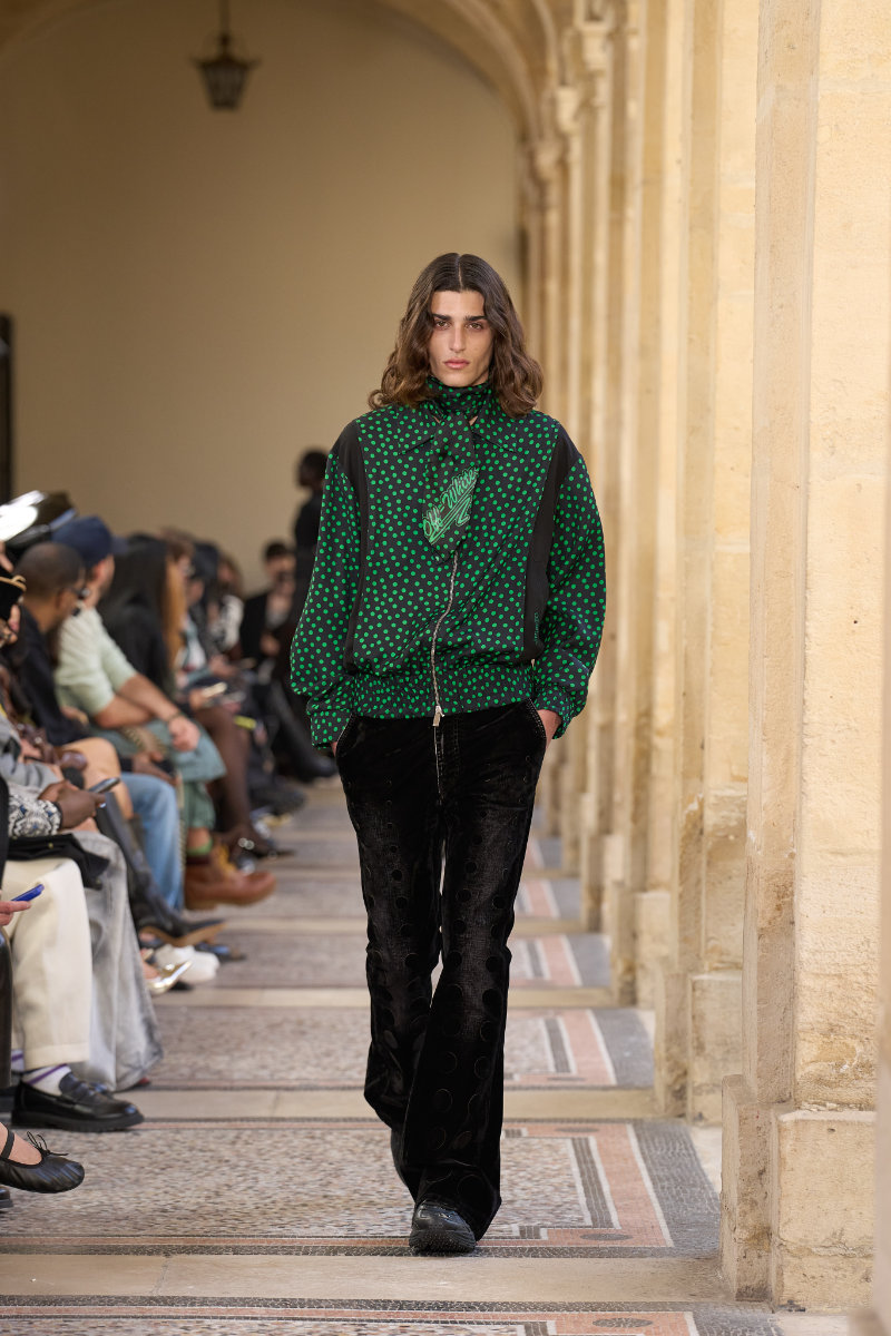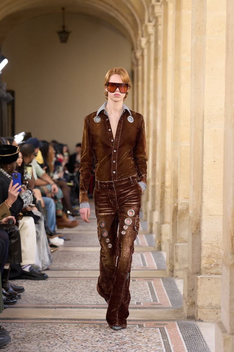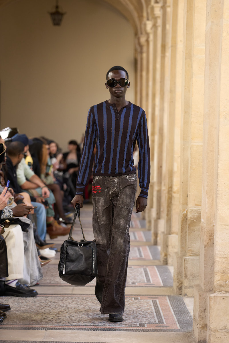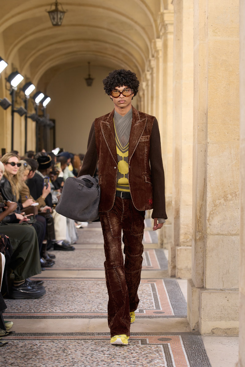 The menswear follows the genre-bending energy of the music. Flared denim. Knitted shirts. Tailored vests and jackets that move between sharp and slouchy. Sartorial codes mix with a street-level ease. Materials feel worked and alive. Nothing sits still.