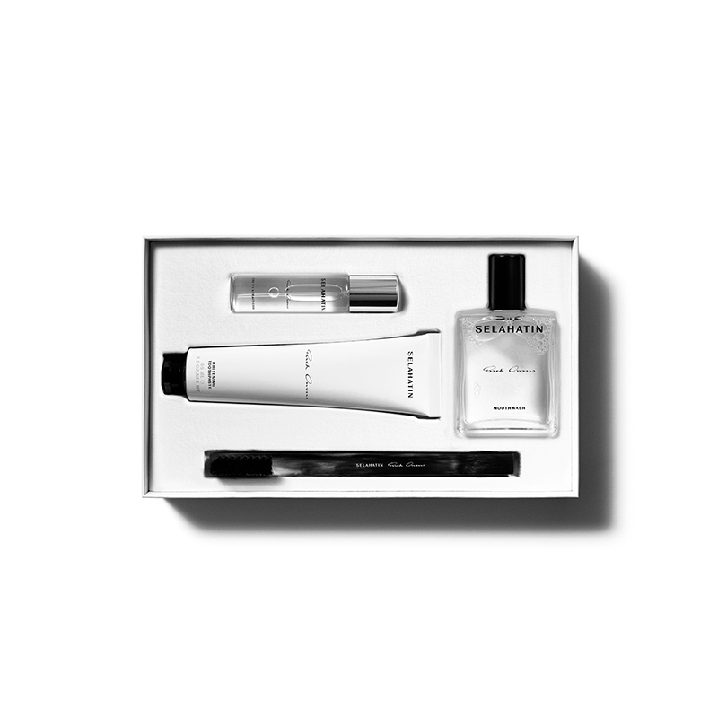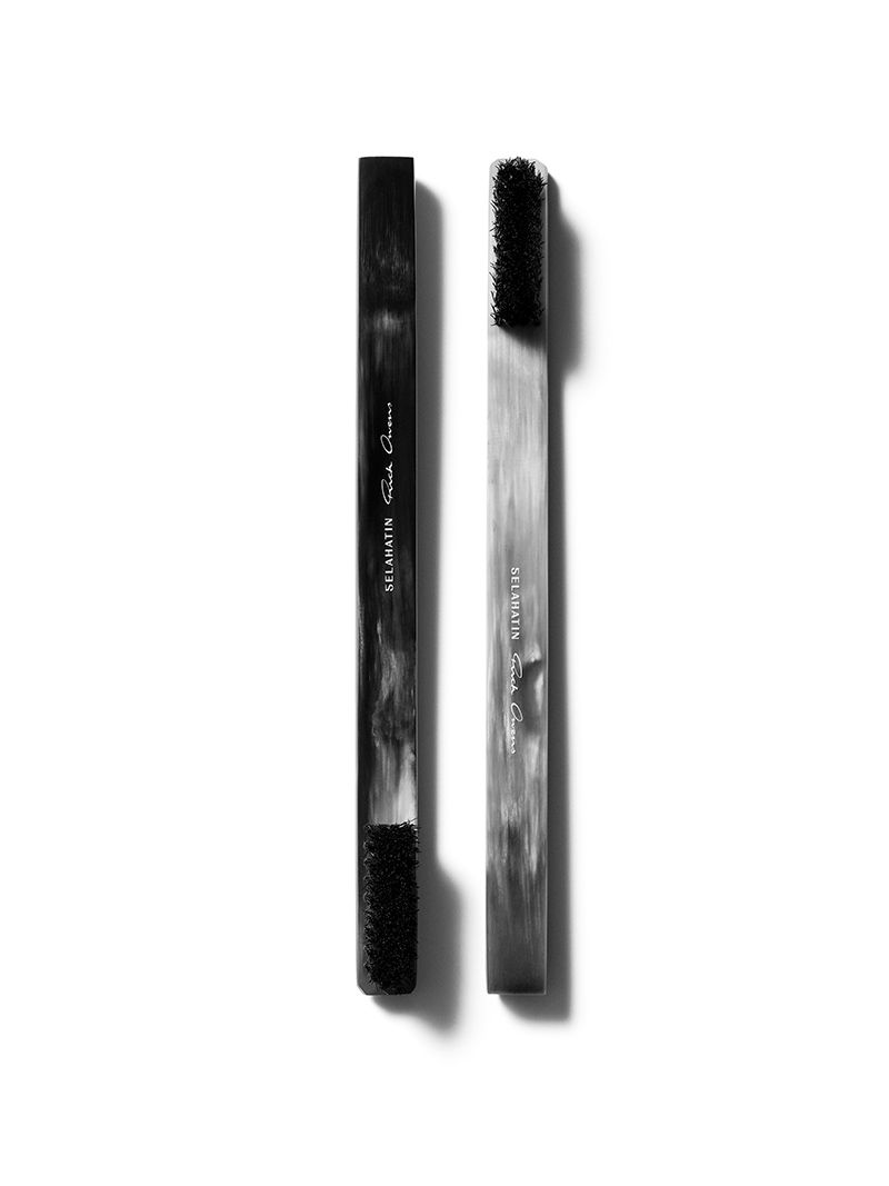 Rick Owens is launching a collaboration with the oral care brand Selahatin. The collection includes four products: a whitening toothpaste, a mouthwash, an oral spray, and a handmade horn toothbrush. They will also be available as a travel set.