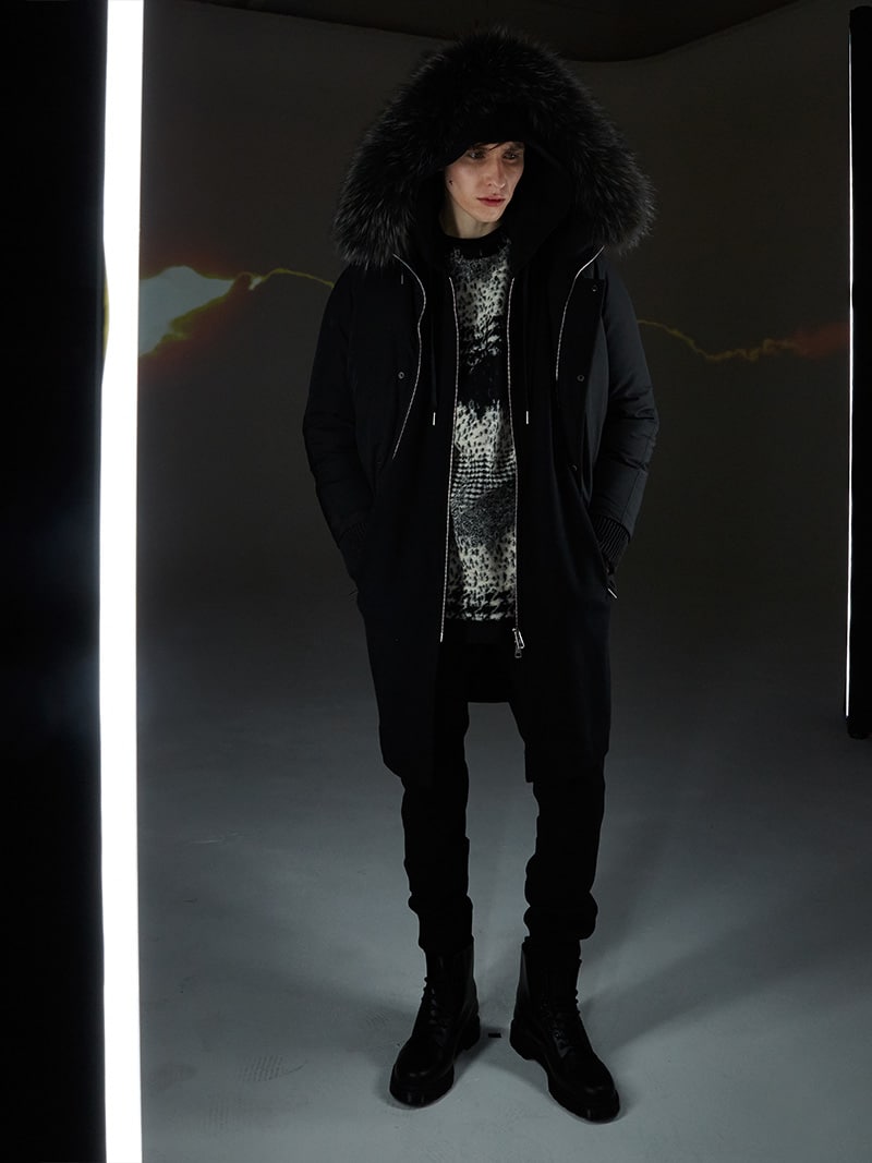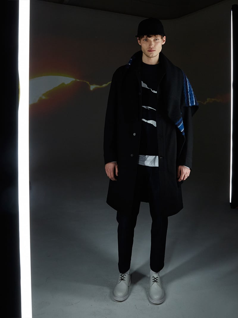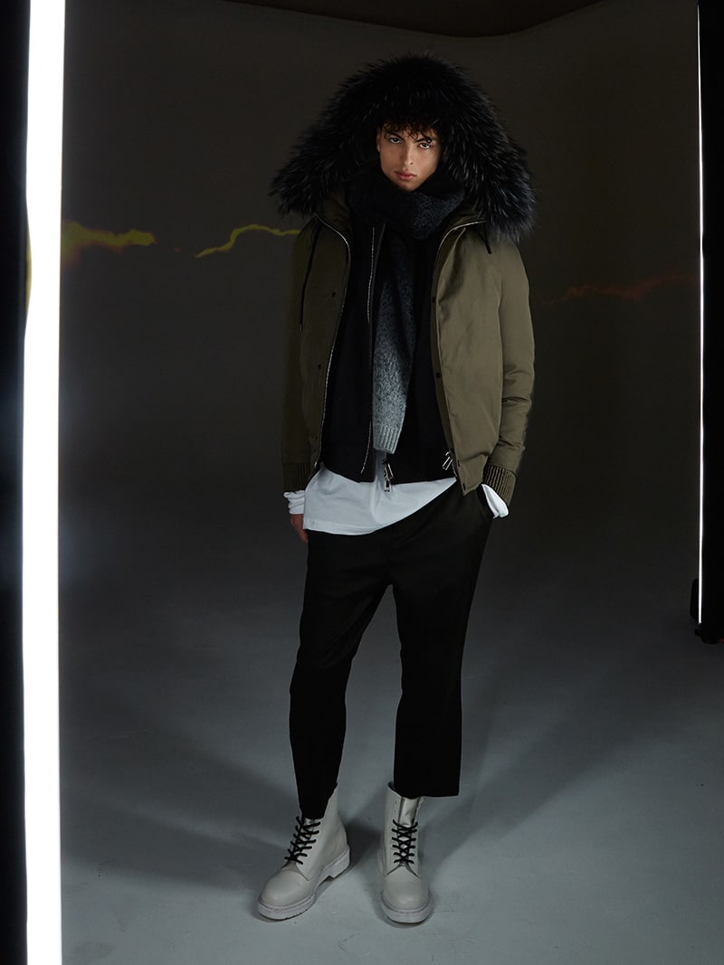 Using familiar materials in an unfamiliar way is a core statement throughout the collection with pressed wool coats, knits infused with rayon, jackets with raccoon fur lining, and fabric blocking. Pops of cyber blue stand against a neutral color palette of black, white and olive.