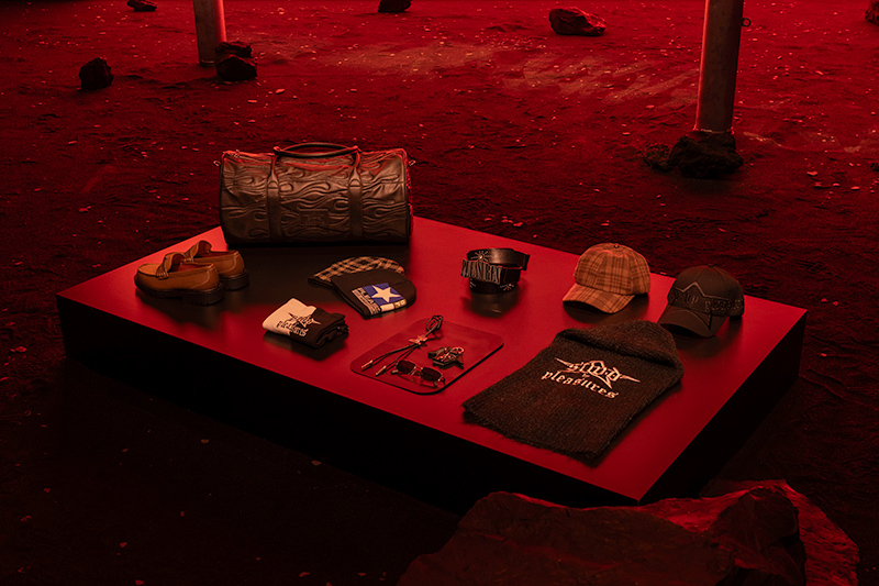 The installation, conceived by artist Arnaud Selve, reinterpreted the collection’s visual themes from an artistic and avant-garde perspective. This approach aligned with the experimental spirit of the Pompidou itself. The designers from PLEASURES explained that the collection draws inspiration from the landscape of their home, Los Angeles, capturing the clash between its urban and rural cultures.