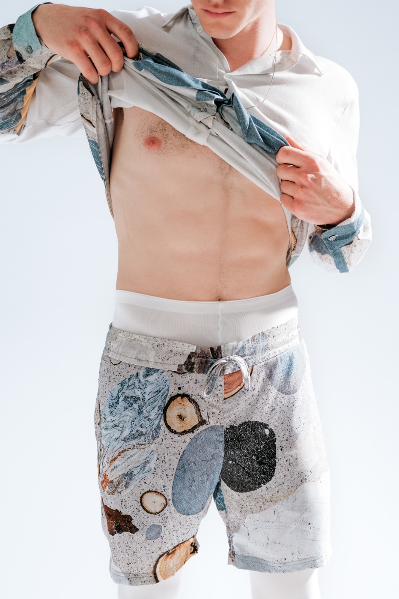 “It all started with us piling up Katja’s stones in geometrical shapes onto silk scarfs. And now we turned them into full body suits and deux pieces. Become one with nature and Switzerland’s traditions. Matching JULIAN ZIGERLI signature penisley prints. Also a swiss tradition, but with a sexy twist. The Appenzellerli chain belt in collaboration with the renowned APPENZELLER GURT gives you that extra Shakira hip-move vibe. Because you wanna be dancing when you hear the cowbells coming down the mountain valley.”