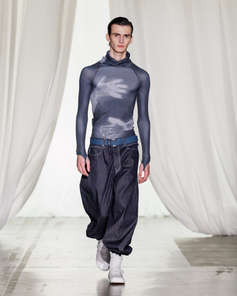 The theme of masking appears literally. Compression tops are printed with a hazy body motif and have a funnel neck that, when pulled up, creates the silhouette of another person. A similar laser-etched technique is used on a raw denim twinset, suggesting the form of an ancient statue.