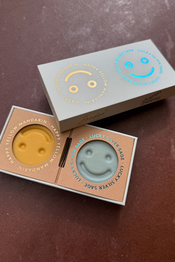 The Julian Zigerli and Soeder collaboration returns with a set of two bar soaps. Presented as a pair, the set works for a gift or for your own use. It frames a everyday act as a small pleasure. The scents, “Happy Yellow Mandarin” and “Lucky Silver Sage,” offer a range from a bright, citrus energy to a calm, herbal freshness.
