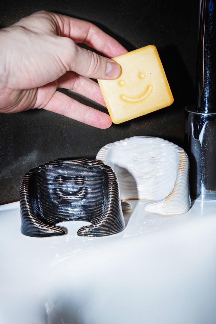 For those who want the full set, there is a companion piece: a 3D-printed ceramic soap holder, available only in their stores. It is a dedicated object for the soap, turning a functional item into a part of the decor.