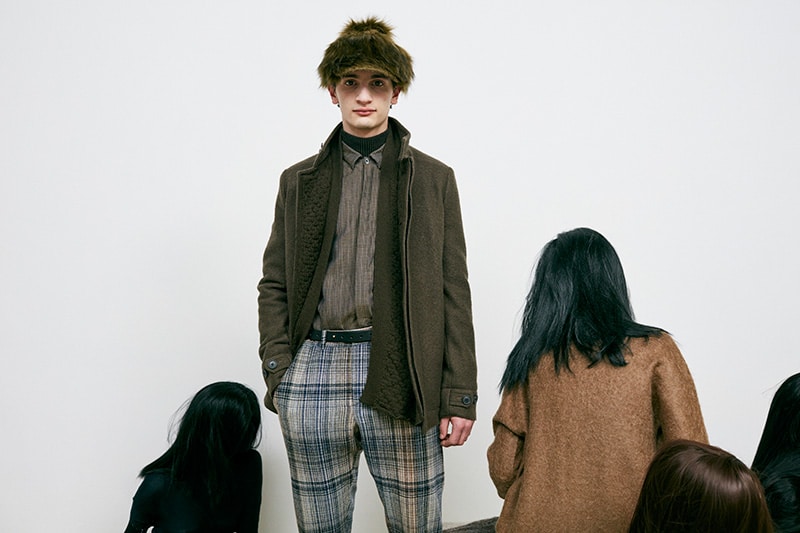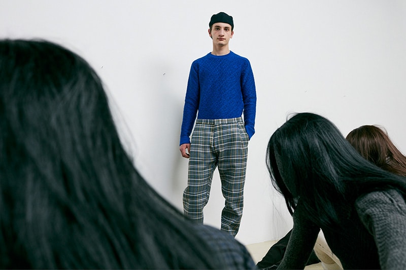 Stephan Schneider presented his Fall/Winter 2018 collection in a tribe of mannequins hanging around on the floor of his Paris showroom. He covered them head to toe with knitwear structures and added black wigs on their heads giving them a weird recognizable yet human expression. The title “Parting” alludes to the clear line in their hairstyle as well as to their act of separation.