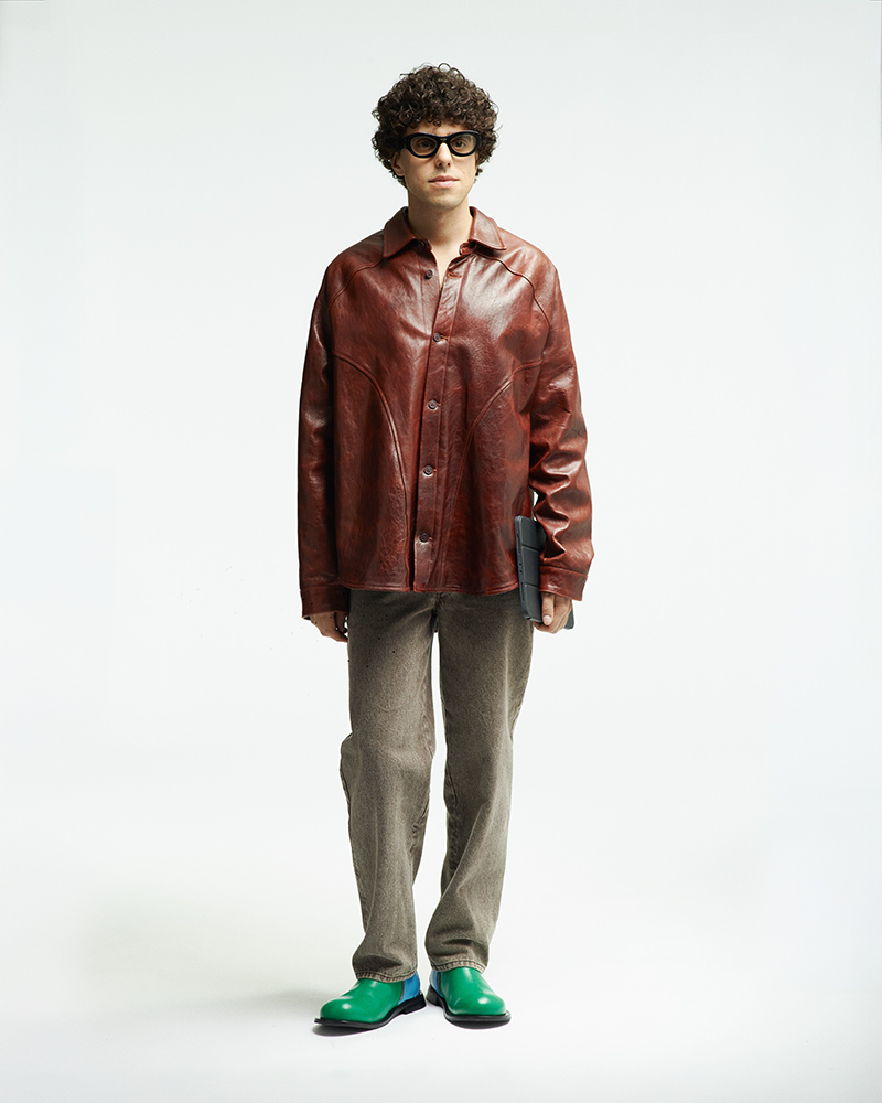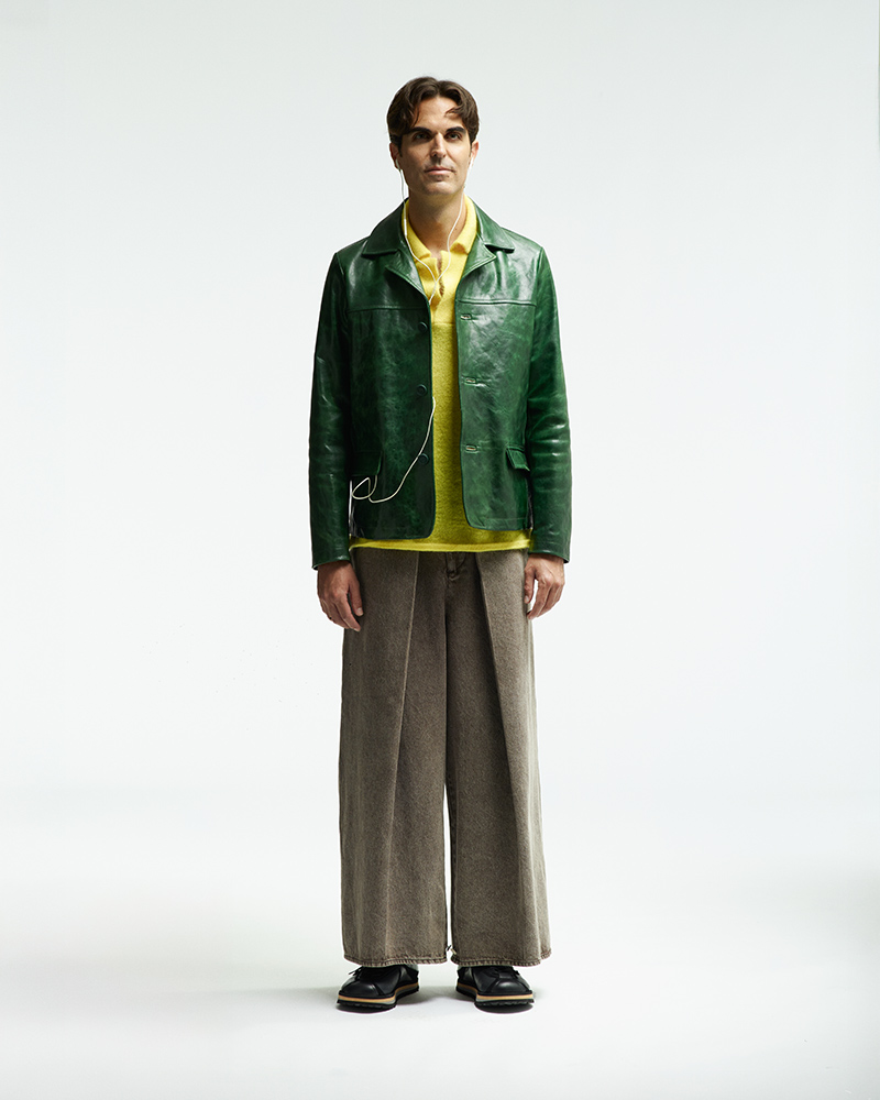 The collection, seamlessly integrated into this conceptual framework, encapsulated Sunnei’s essence. Purist minimalism, sharp tailoring, and architectural silhouettes designed for a cosmopolitan community immersed in art and design. The menswear offering stood out with supple leather pieces, experimental trousers with wing-like shapes reminiscent of bats, and footwear defined by rounded toes that injected contemporaneity while retaining distinction. Glasses —both nerdy and alluring— sealed the imagery with a balance of intellect and seduction. A palette dominated by dark tones was punctuated with flashes of blue in multiple shades and precise touches of green, bringing vibrancy to the line-up.