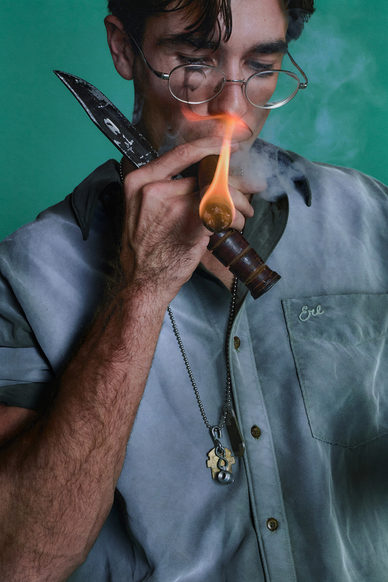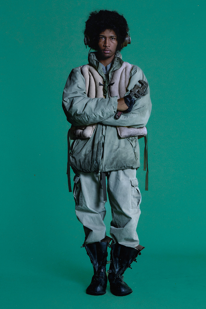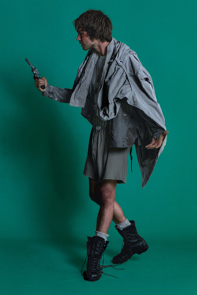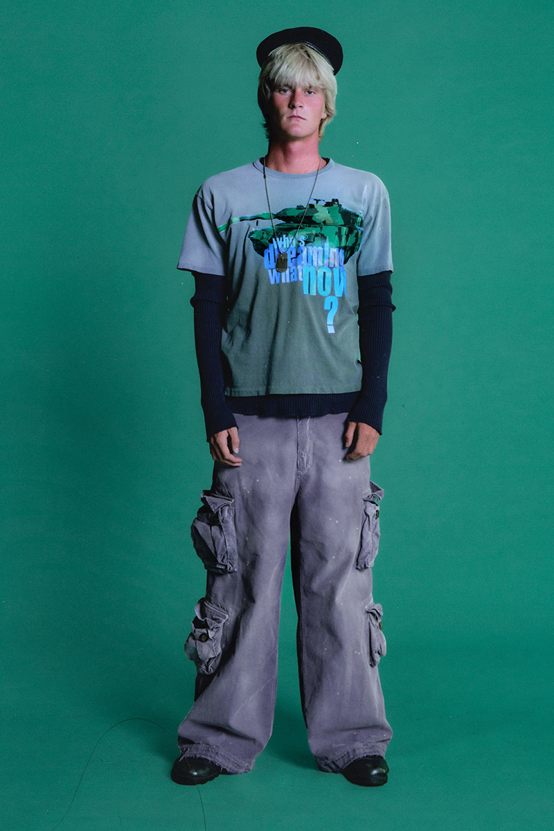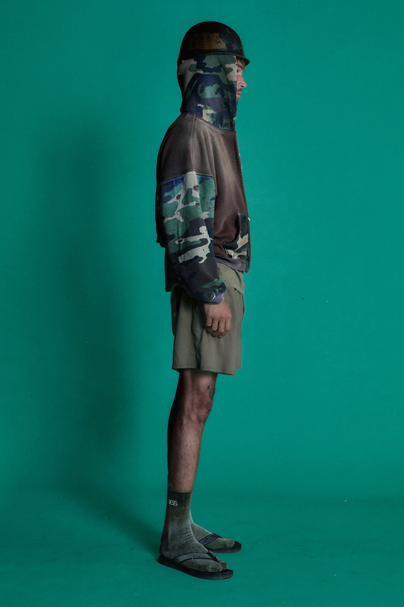ERL SURPLUS acts as a contemporary version of these spaces. It creates an echo between past and present, pulling imagery from different eras. The collection features patchwork patterns made from threadbare fatigues and faded insignia. It is a depot where military overflow becomes California banner wear.