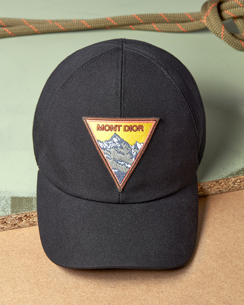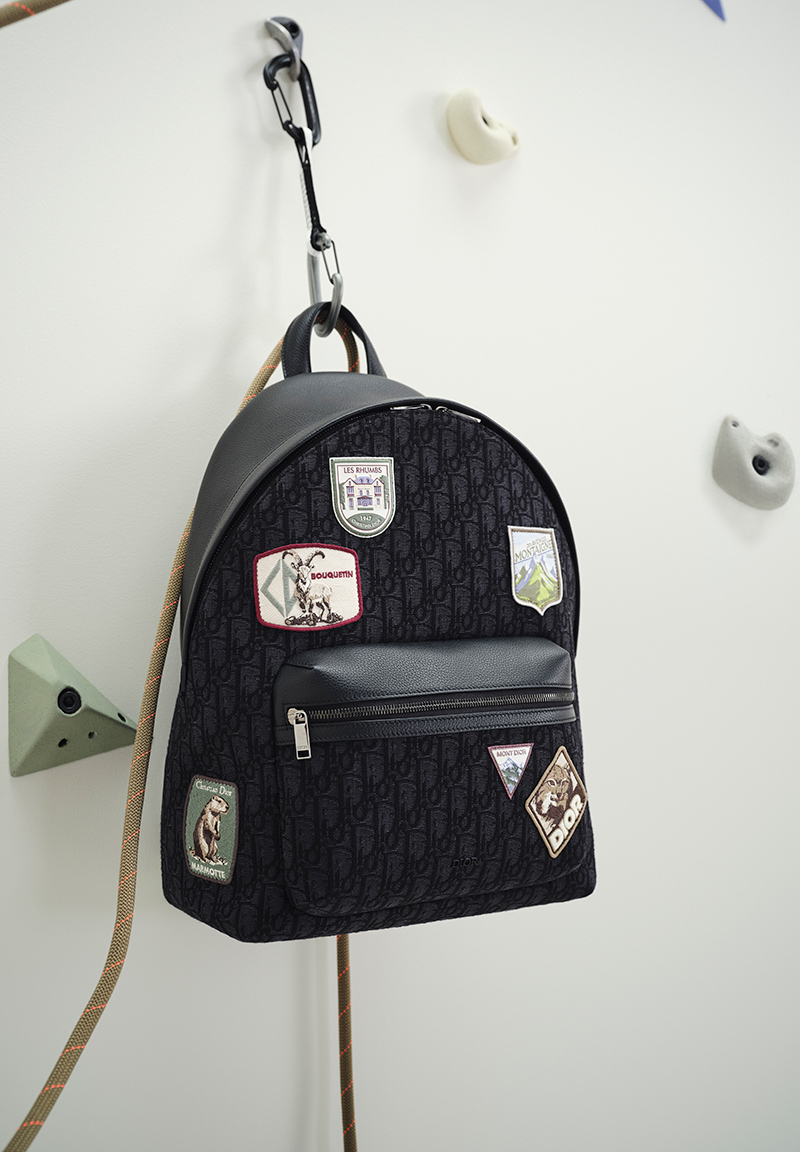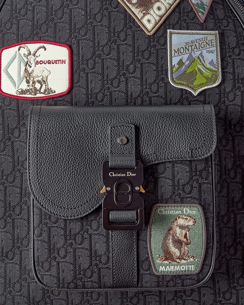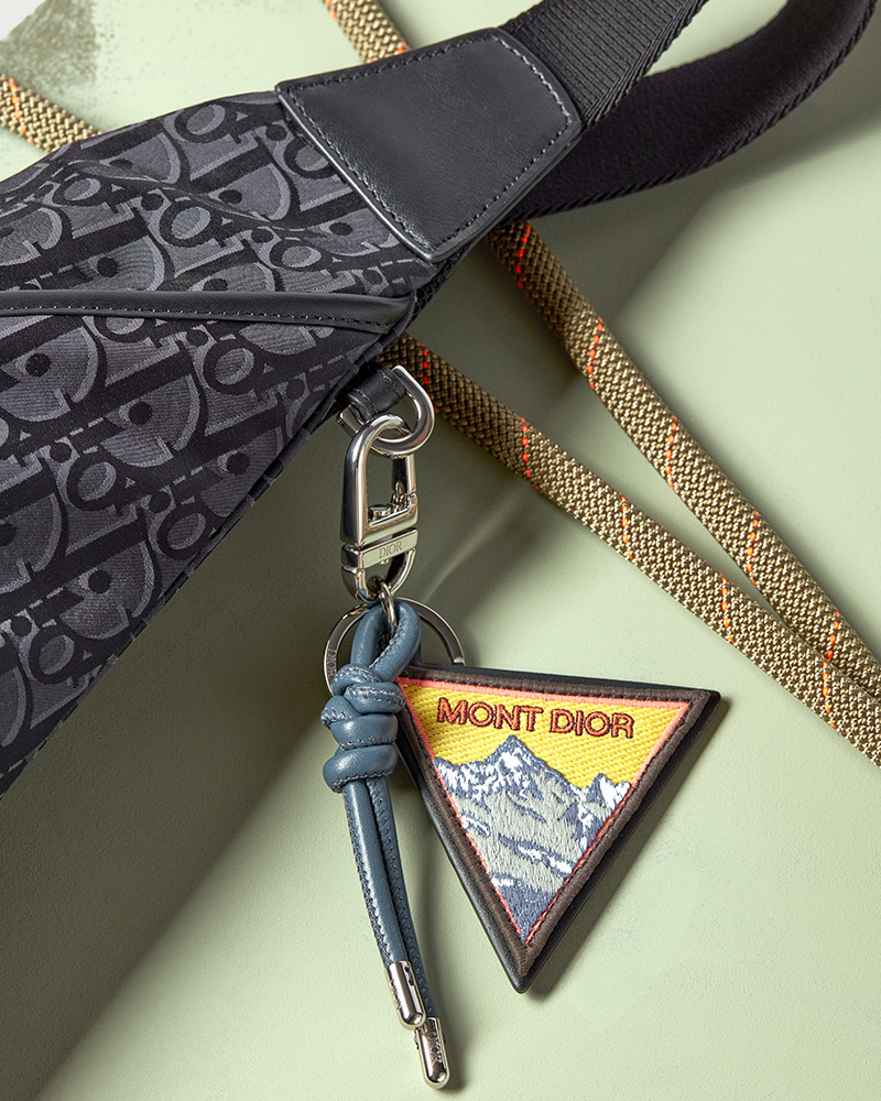 The collection pairs blazers and turtlenecks with cargo pants or ski pants. Shirts feature classic ivy league checks in colors like blue, burgundy, and brown. The sportswear side is explored through technical canvas pieces with clean lines. This includes hooded windbreakers with reflective stripes, long coats, and fleece jackets. The house’s creative audacity is reflected in bags and small leather goods. The iconic Saddle bag appears as a messenger bag, a triple pouch, and a zipped backpack. These, along with jewelry and hats, are adorned with special Dior Mountain patches.