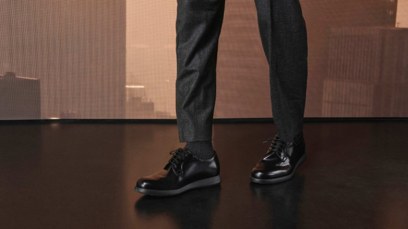 The change is in the sole. It is a wedge, made from a compound of rubber and air. This makes the shoes ultra-light and flexible, with the cushioning of a sneaker. The tread pattern nods to a classic Church’s design, but the feel is entirely new. The idea is simple: a formal shoe that can keep up.