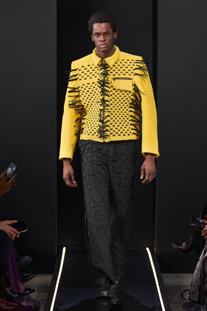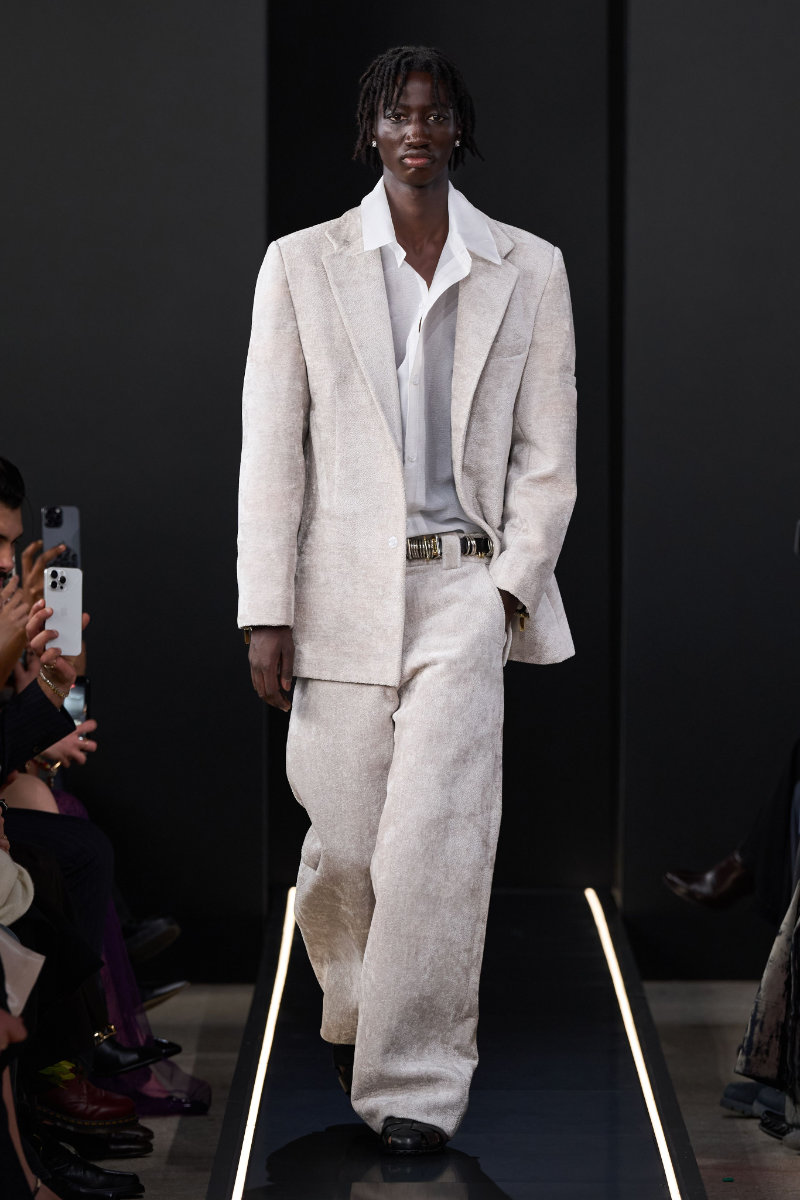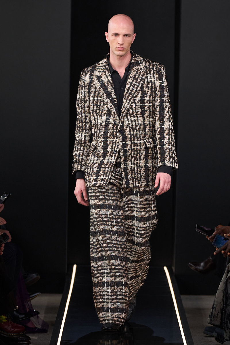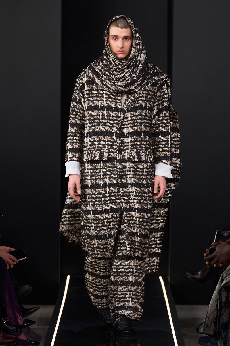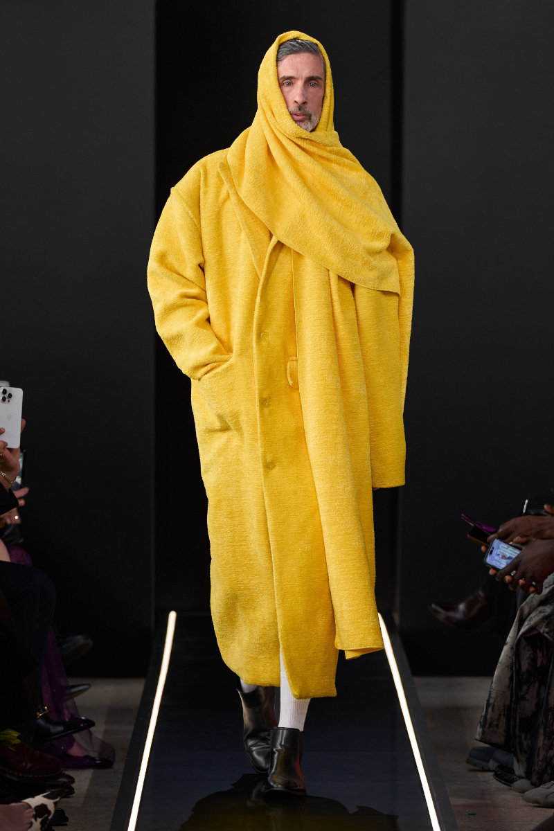 The silhouettes carry this idea. Shoulders are defined but not stiff. Waists are suggested rather than squeezed. Volume shows up in controlled ways, through long coats and layers that wrap around the body without overwhelming it. Tailoring stays sharp, with clean lines and lapels that know what they are doing. But draped elements and wrapped constructions bring something softer alongside the precision. Structure is there to support, not to dominate.