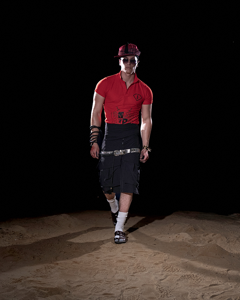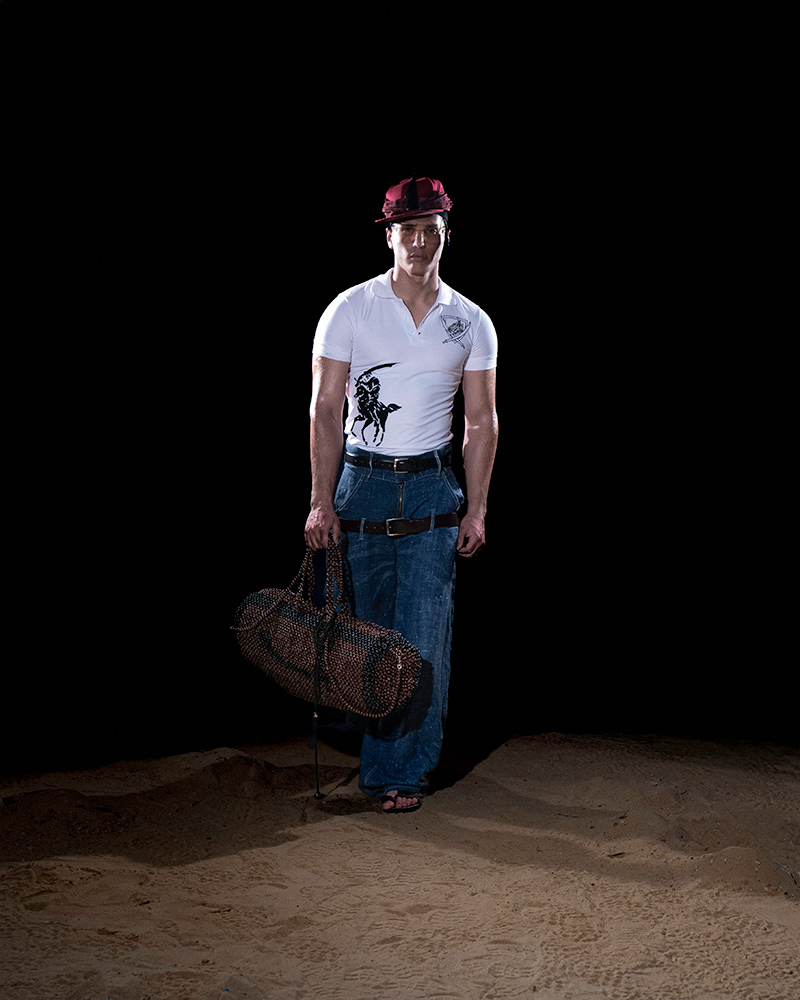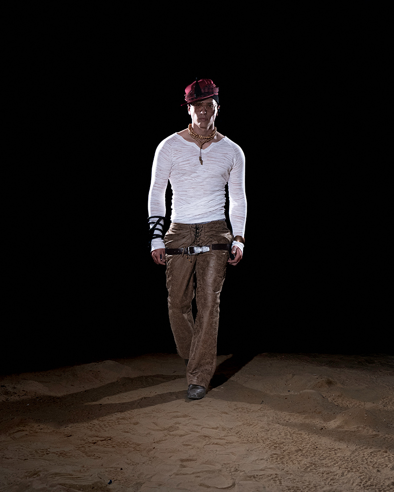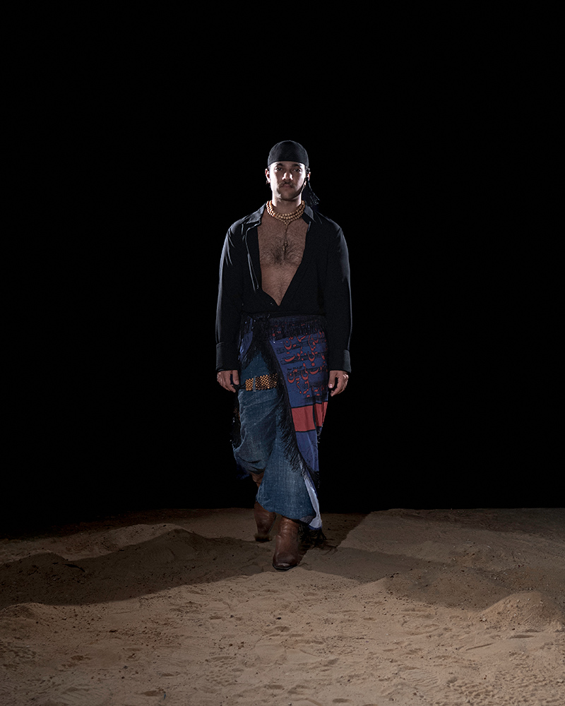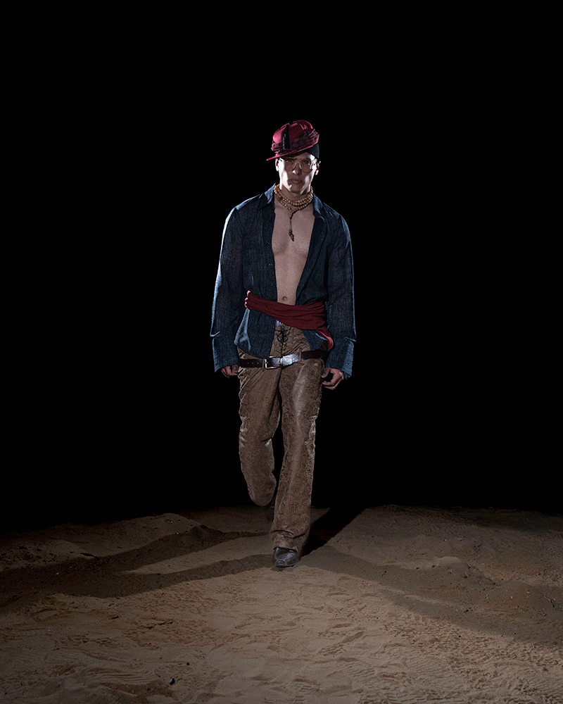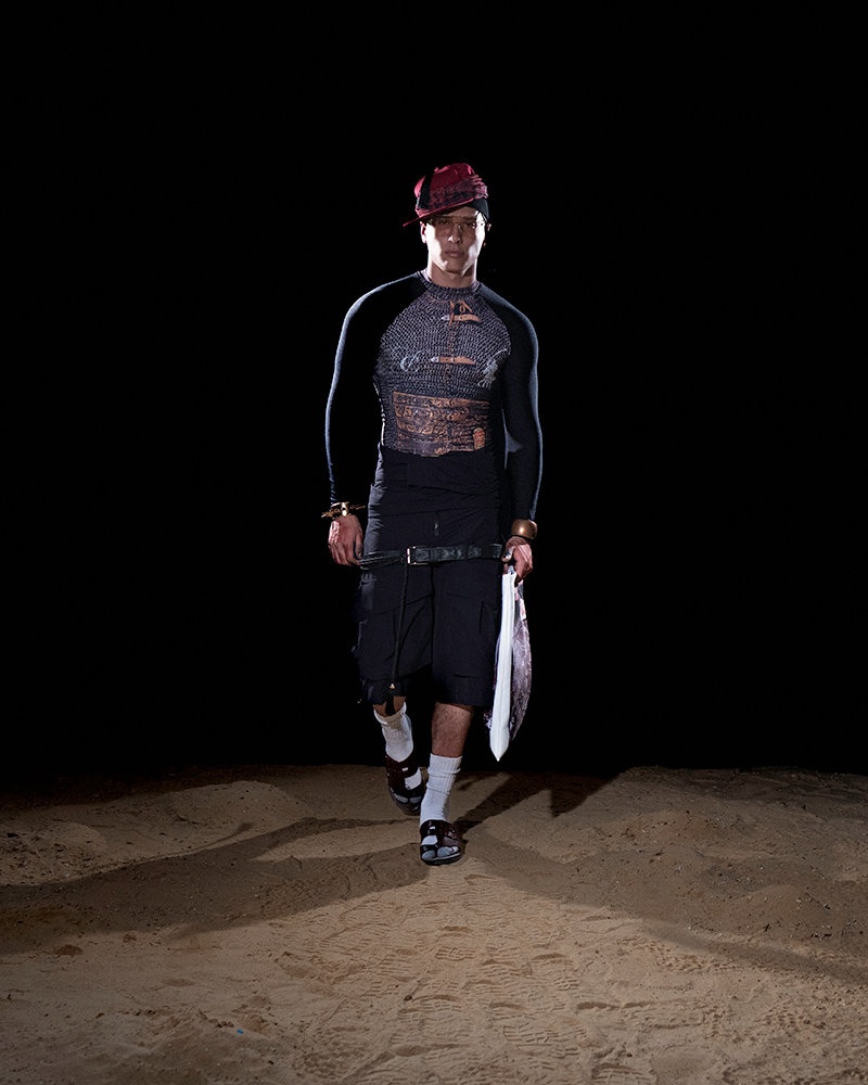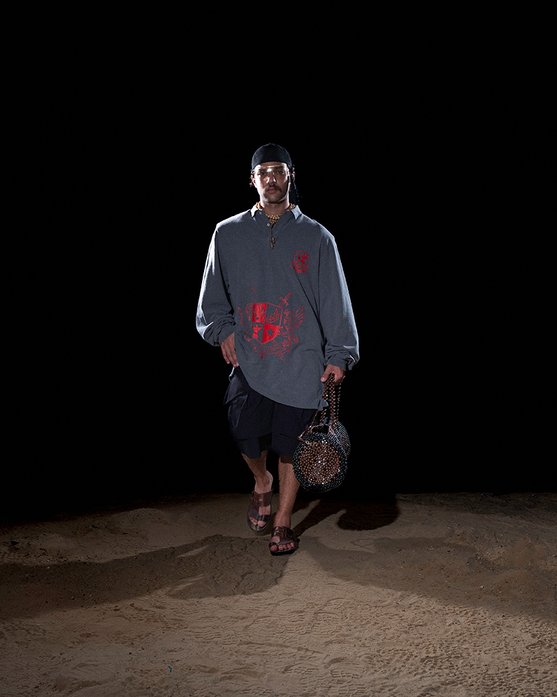The clothes make this repetition feel physical. References from the 2010s, the 2000s, and the 1990s sit next to medieval shapes. It is proof that history does not just repeat itself. It recycles. Linen is made to look like denim. Polos are carved from wood. A plastic shopping bag is recreated in scuba material. Each piece claims one identity while hiding another, mirroring how power dresses itself in charm to hide its contradictions.