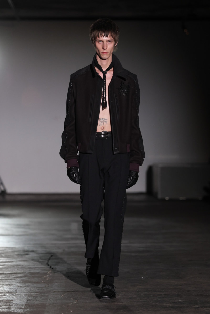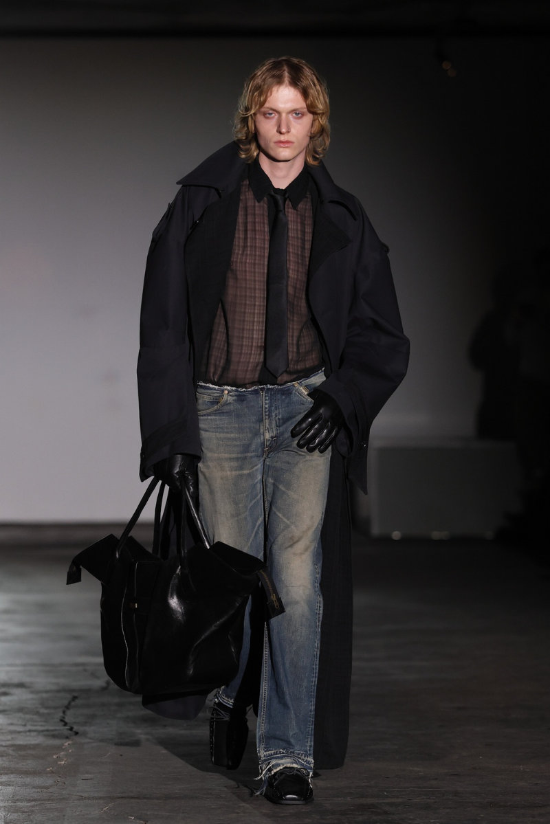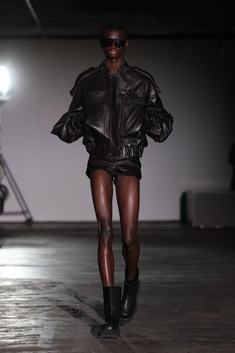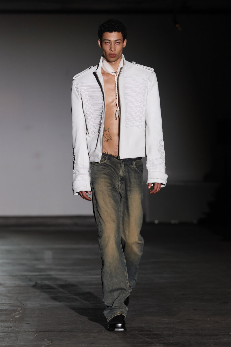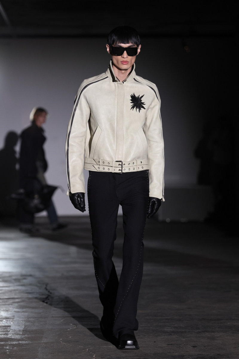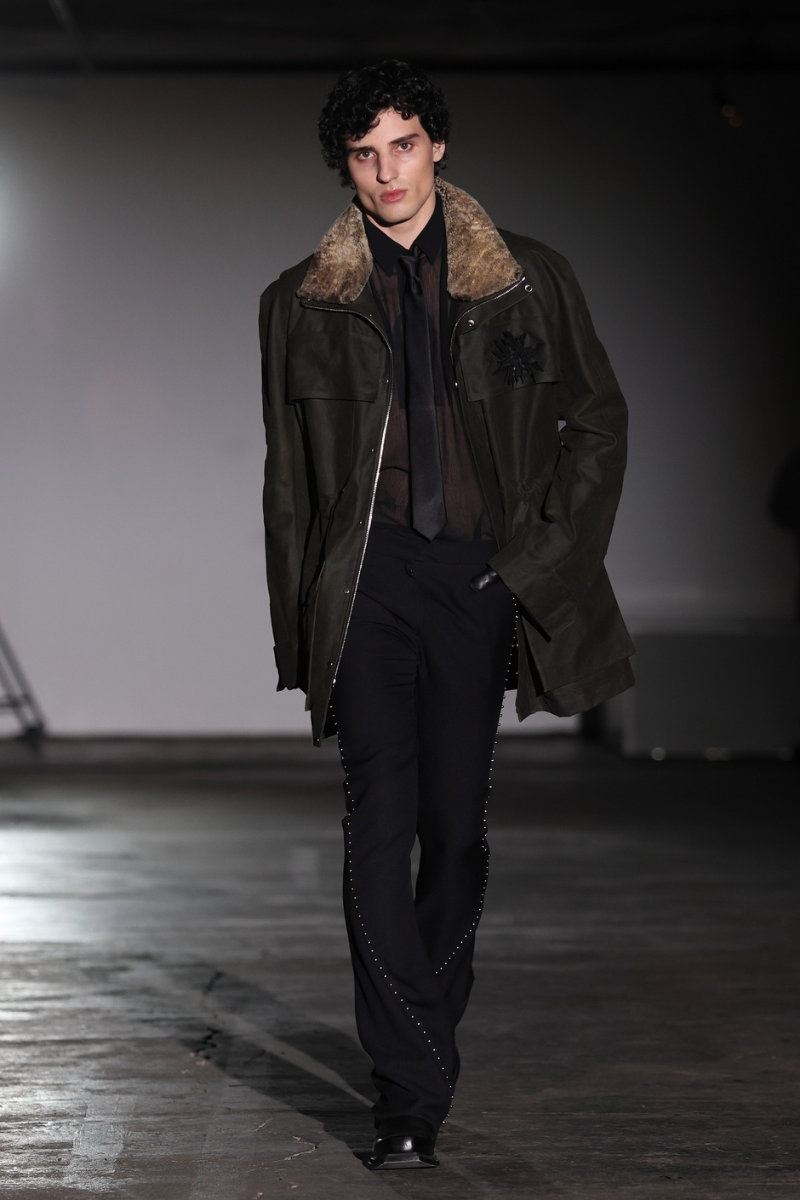 This debut show was a look inward. It avoided any external theme. The goal was to present the brand’s core identity directly. The collection distilled its essence: rockstar chic, mysticism, and a brutalist point of view. The shapes moved between sharp minimalism and strong architectural forms. Details included epaulettes, studs, and transparent fabrics. Leather and Napoleonic accents appeared alongside upcycled fur. These elements created a dialogue between structure and exposure.
