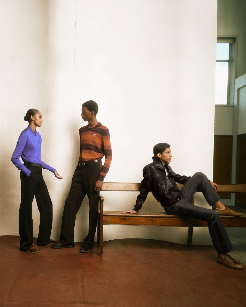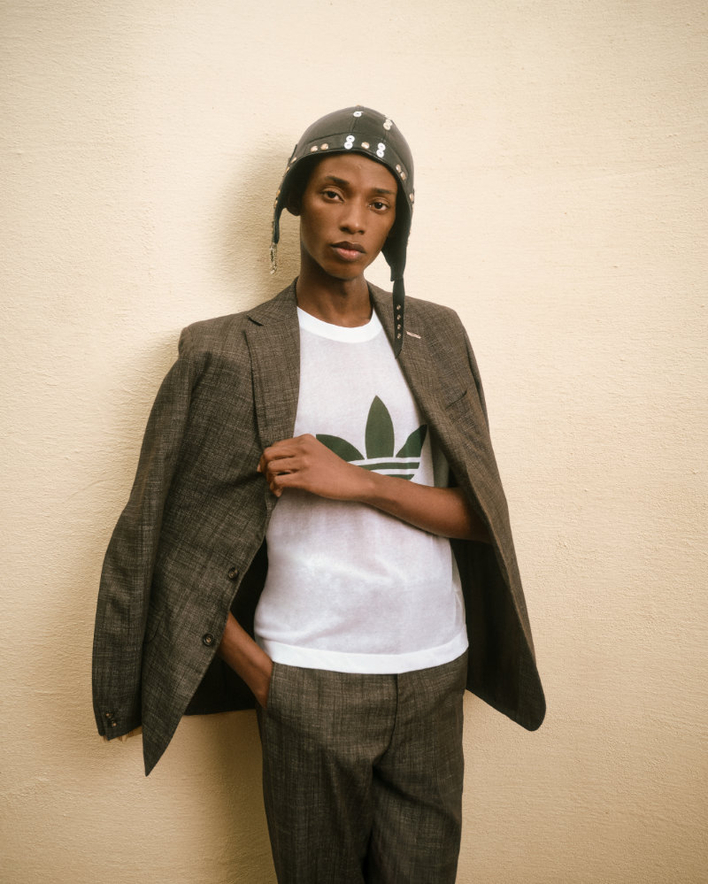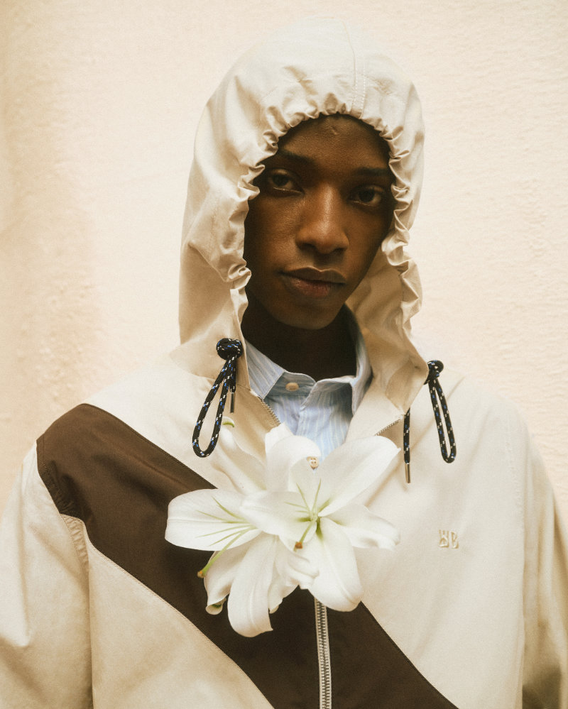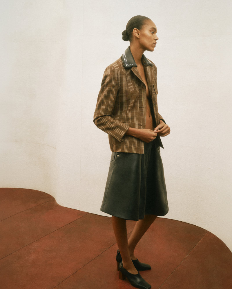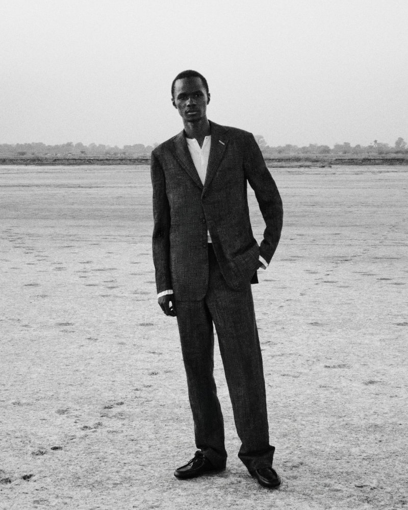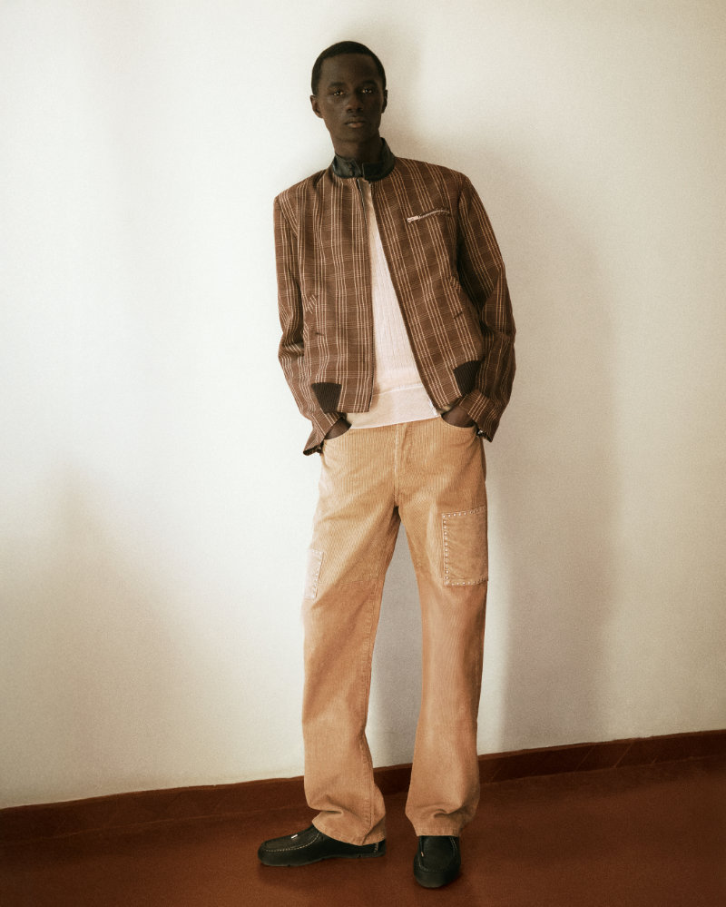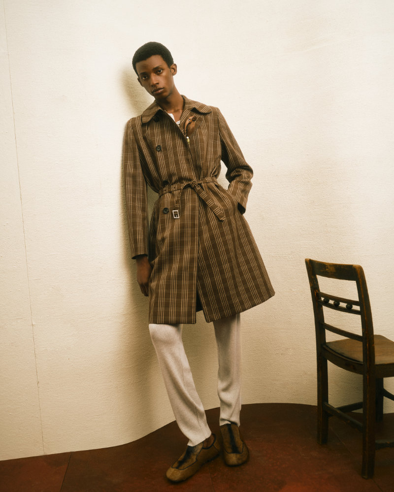 The presentation atmosphere was set by John Coltrane’s Meditations, suggesting a space of harmony and cultural exchange. This combination appears in the clothing through a seasonal take on Madras check and Bengal-stripe shirting in crinkled cotton. The collection is adorned with architectural brooches made in Botswana from Panga Panga wood and semi-precious stones by artisans Beullah Serema and Peter Mabeo.