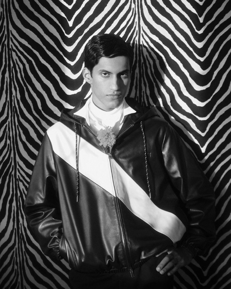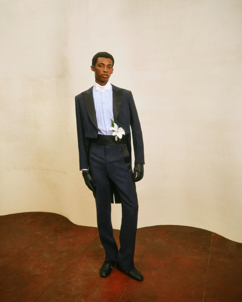 Ease is provided through tonal cotton and merino knits made in collaboration with the English maker John Smedley. An indigo linen tuxedo from Savile Row tailors Anderson & Sheppard offers a lighter formal option. The new mainline footwear is the Studio Moccasin, presented in a zebra-print pony hair.