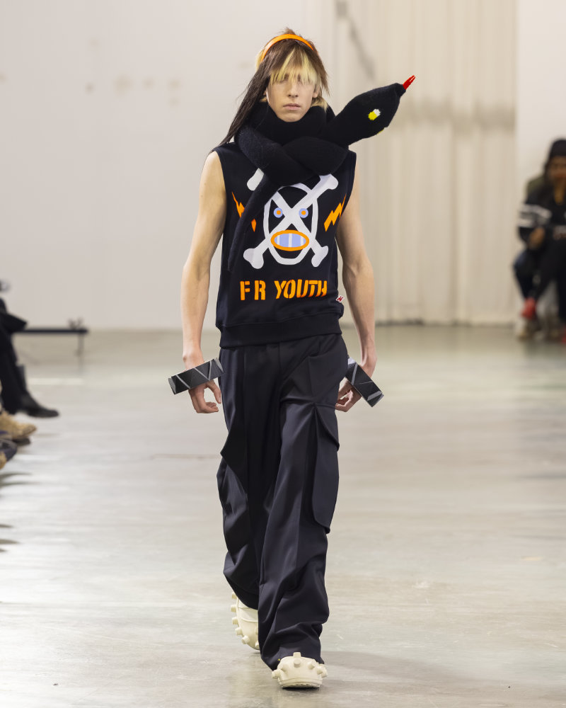 Walter Van Beirendonck‘s Fall/Winter 2026-2027 collection, SCARE the CROW / SCARECROW, is inspired by the designer’s deep love for Art Brut and the pure hope and raw energy from childhood; the tension between aggression and tenderness. The show opened with a motorcycle with flowers and guns covered in yellow-colored protective sheets like the ones placed over sculptures and items we desire to preserve, showing us how, in this collection, covers become fabrics and bodies are moving underneath. The youth of today can be described through this collection, through a vocabulary of contradiction. The creative director makes a statement about youth being for real, presented with t-shirts that ask “HI THERE, ARE YOU FR?” to represent the current tendency of dismissing new generations.