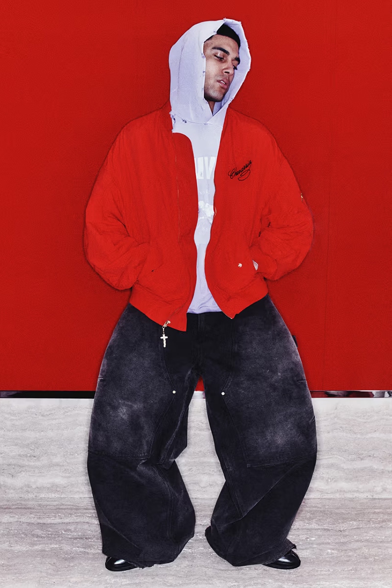 Complementing the aforementioned is a wide range of relaxed, oversized clothing such as bomber jackets, hooded and non-hooded sweatshirts, washed T-shirts with “WILLY” graphics, or jeans, paired with hats with ACLU logos and farm produce graphics, and lace-up and heeled shoes.