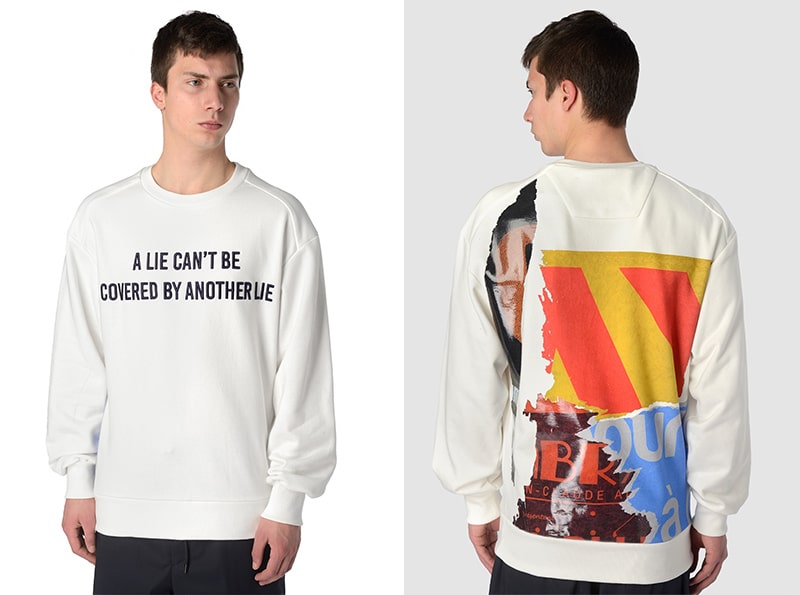 Airflow jackets and “bounded” sweatshirts bring the ambiguity of military life into focus. while the striped loose shirts – one of JUUN.J’s signature silhouettes – bearing strong and positive loud messages, disrupt many of the principals associated with the army.
