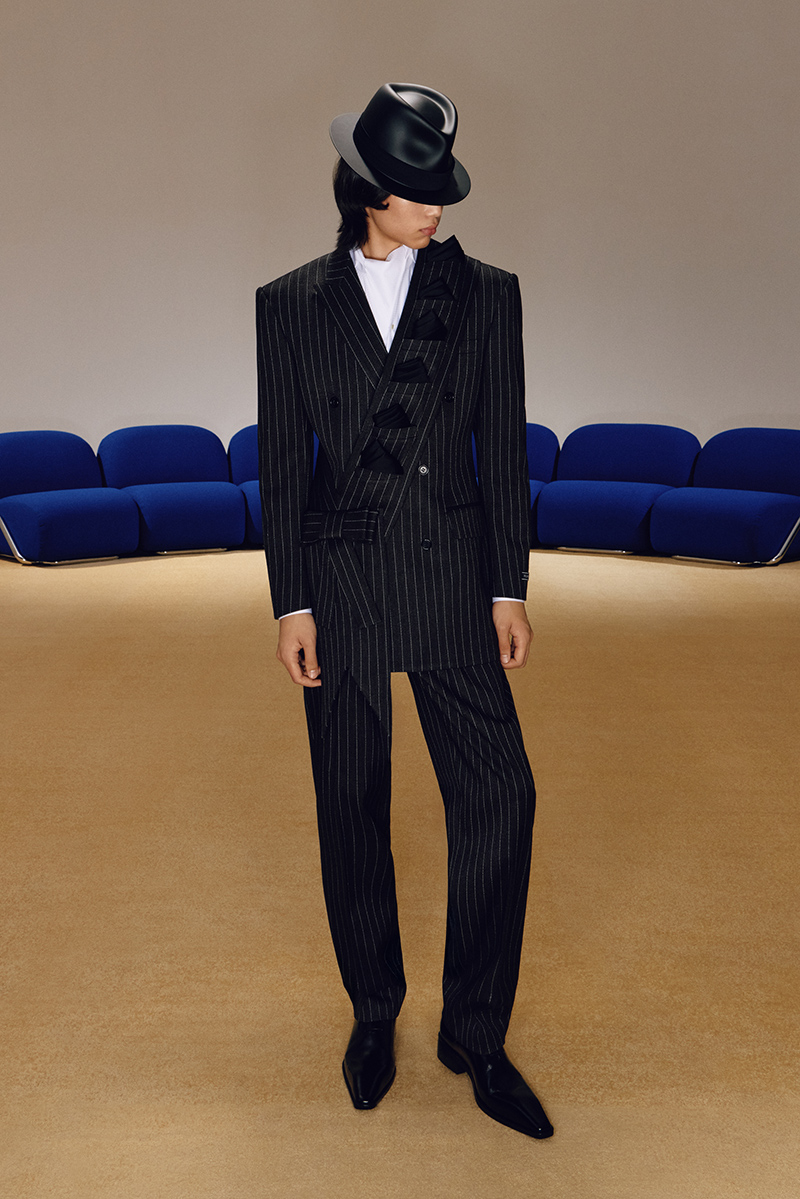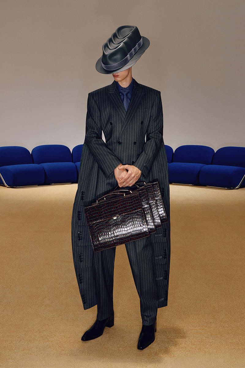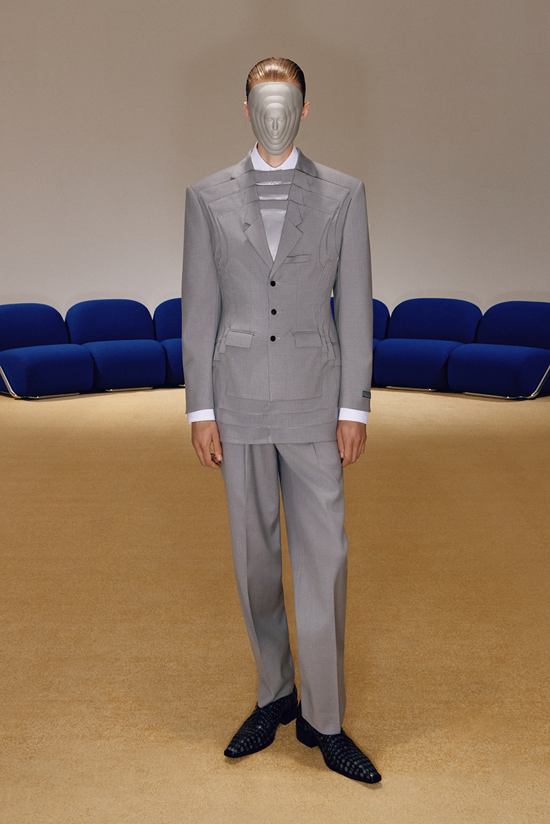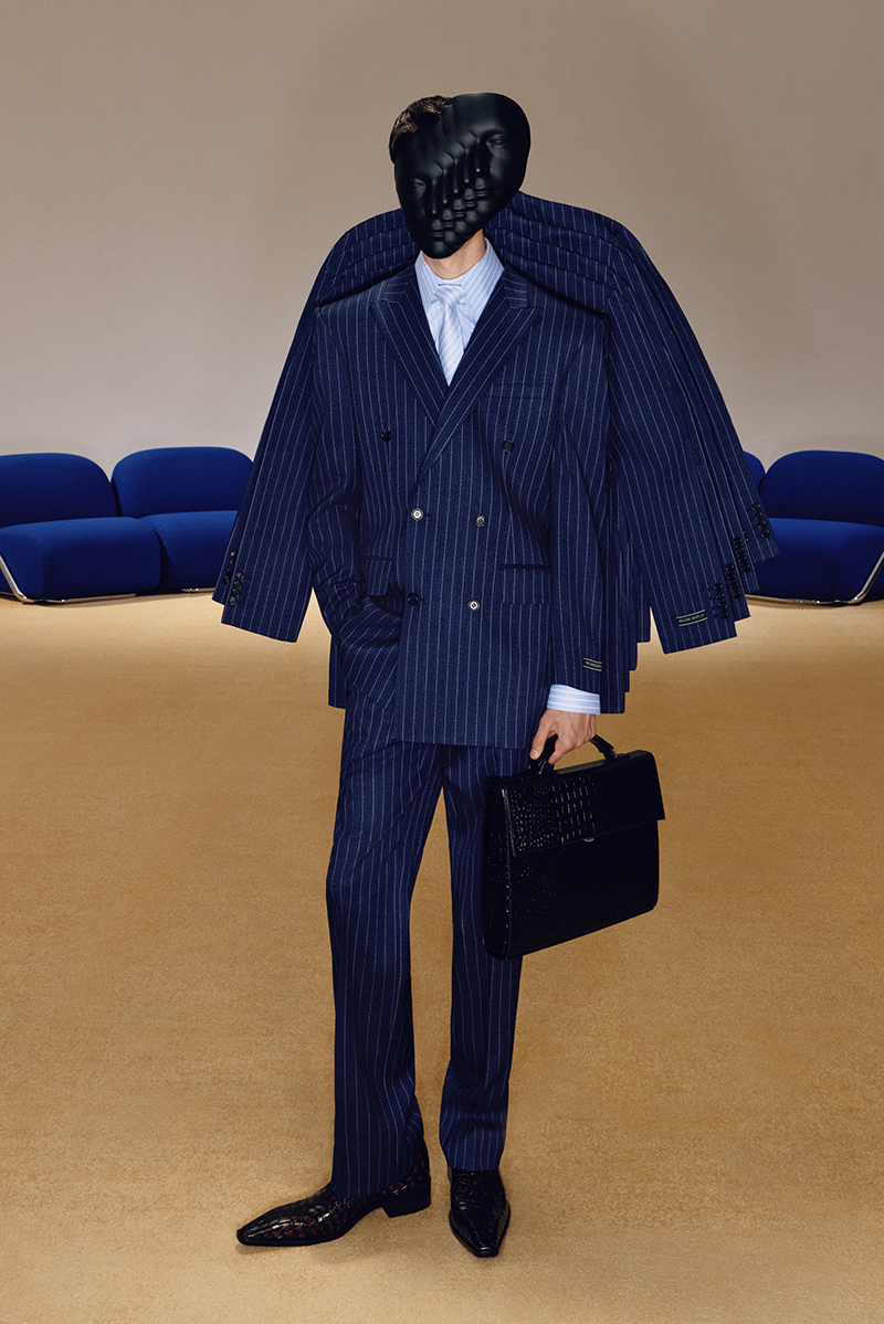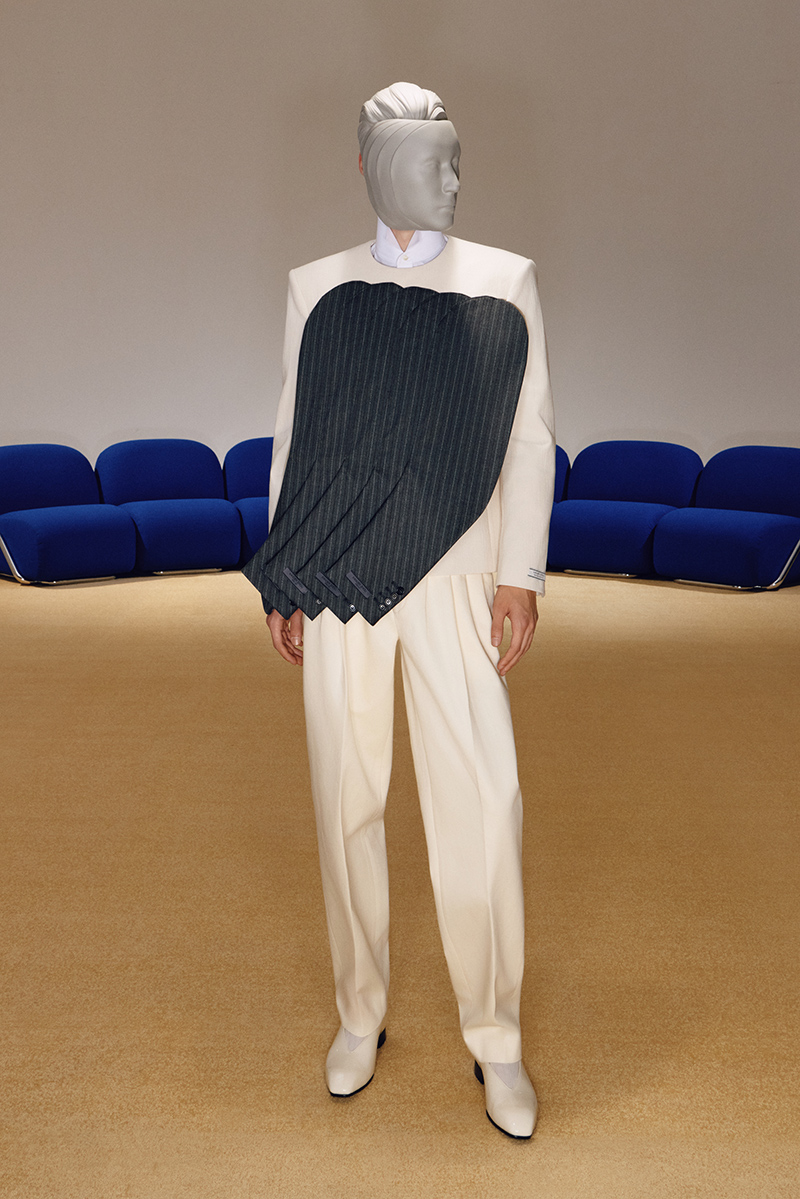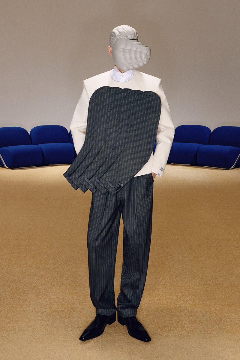 If past collections looked to astronauts and cosmic systems, this one looks at a parallel version of our own world. Here, the suit is the default interface assigned by a system. The recursive tailoring and extended accessories make people look like social identities stuck in an infinite loading loop.