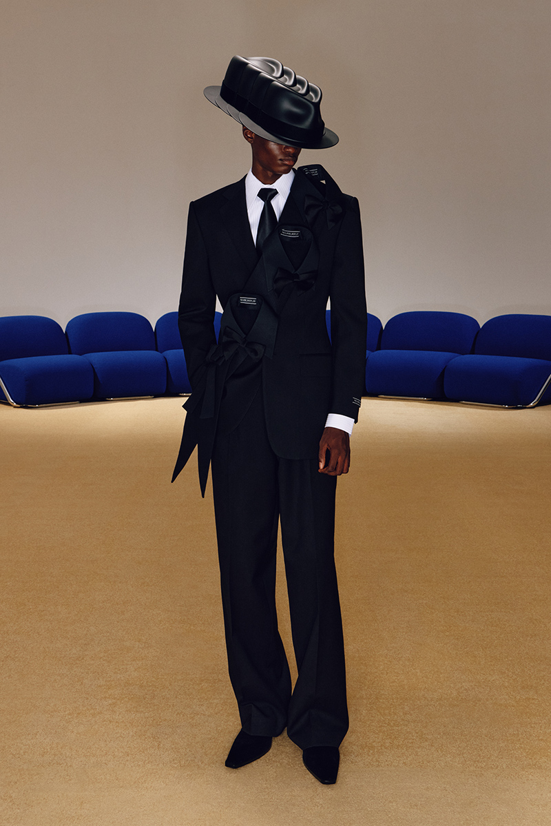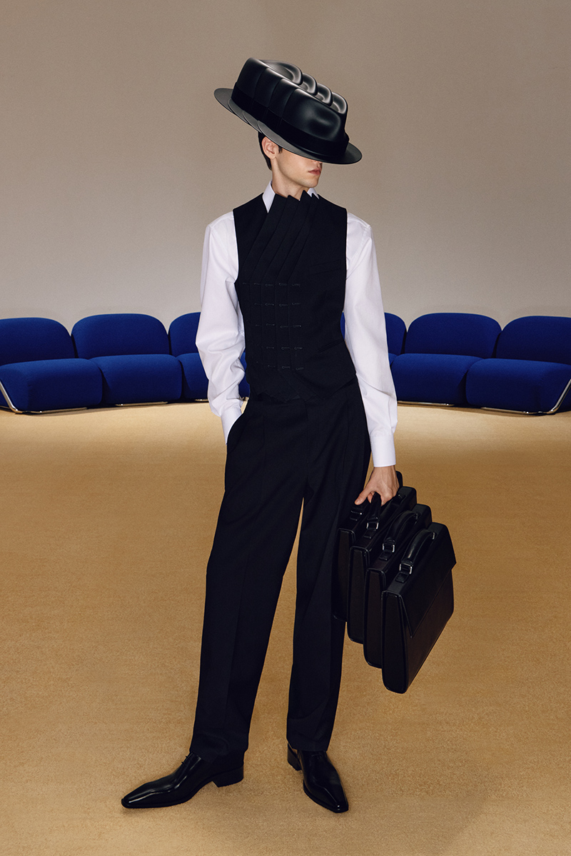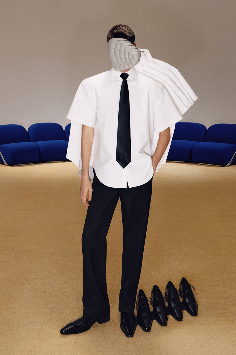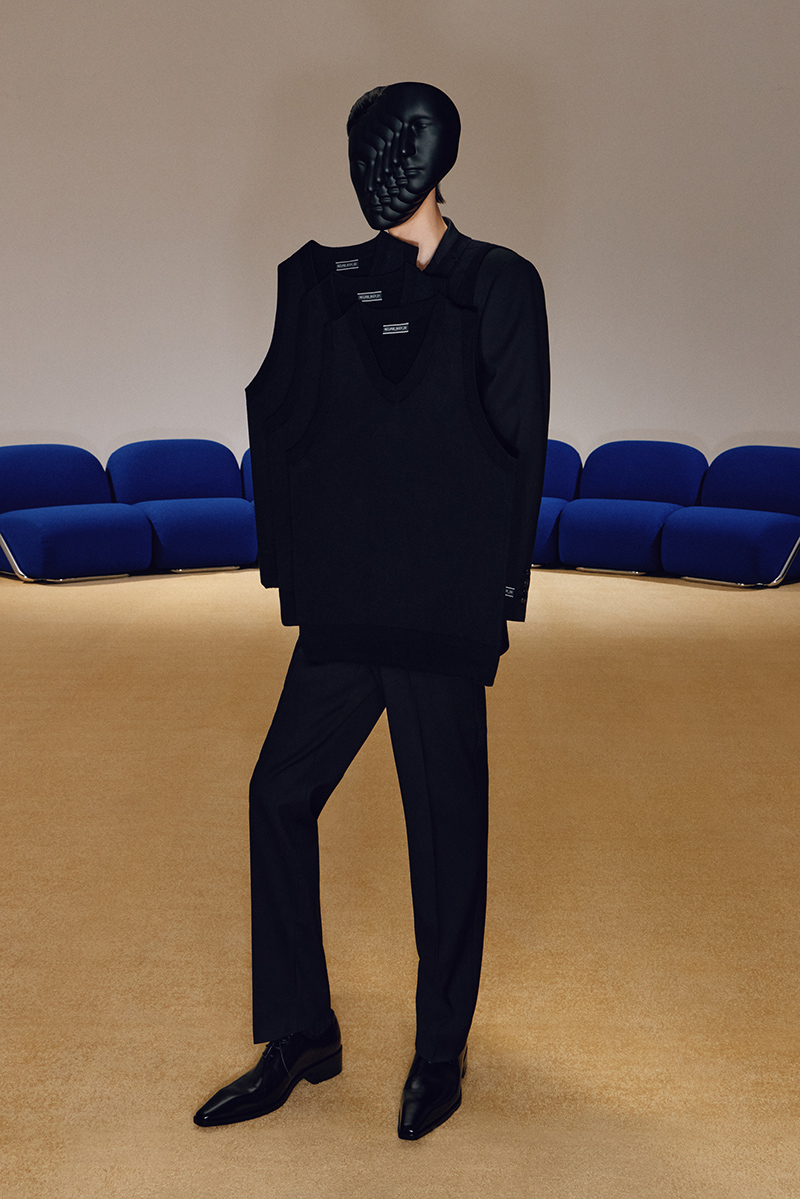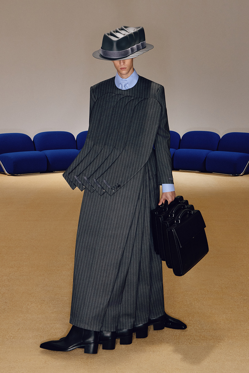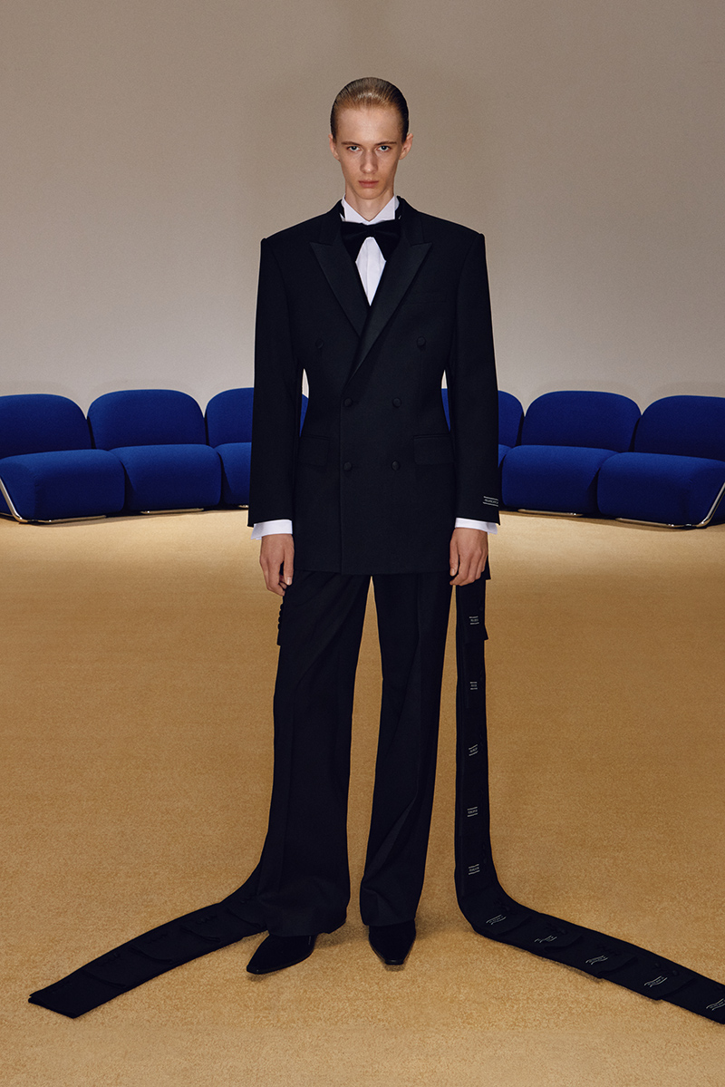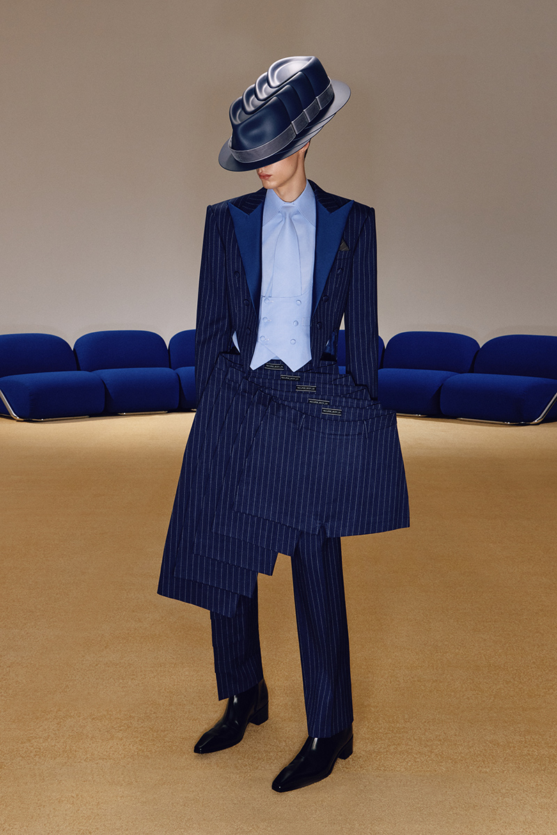 If past collections looked to astronauts and cosmic systems, this one looks at a parallel version of our own world. Here, the suit is the default interface assigned by a system. The recursive tailoring and extended accessories make people look like social identities stuck in an infinite loading loop.