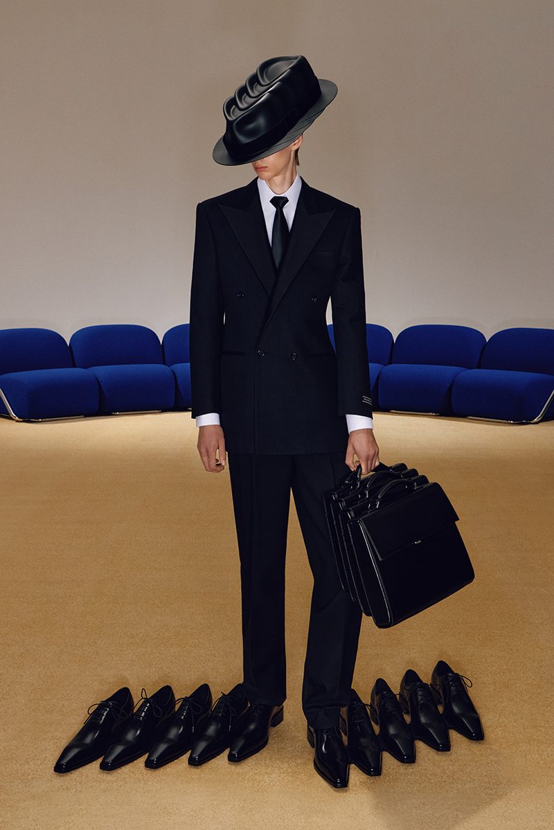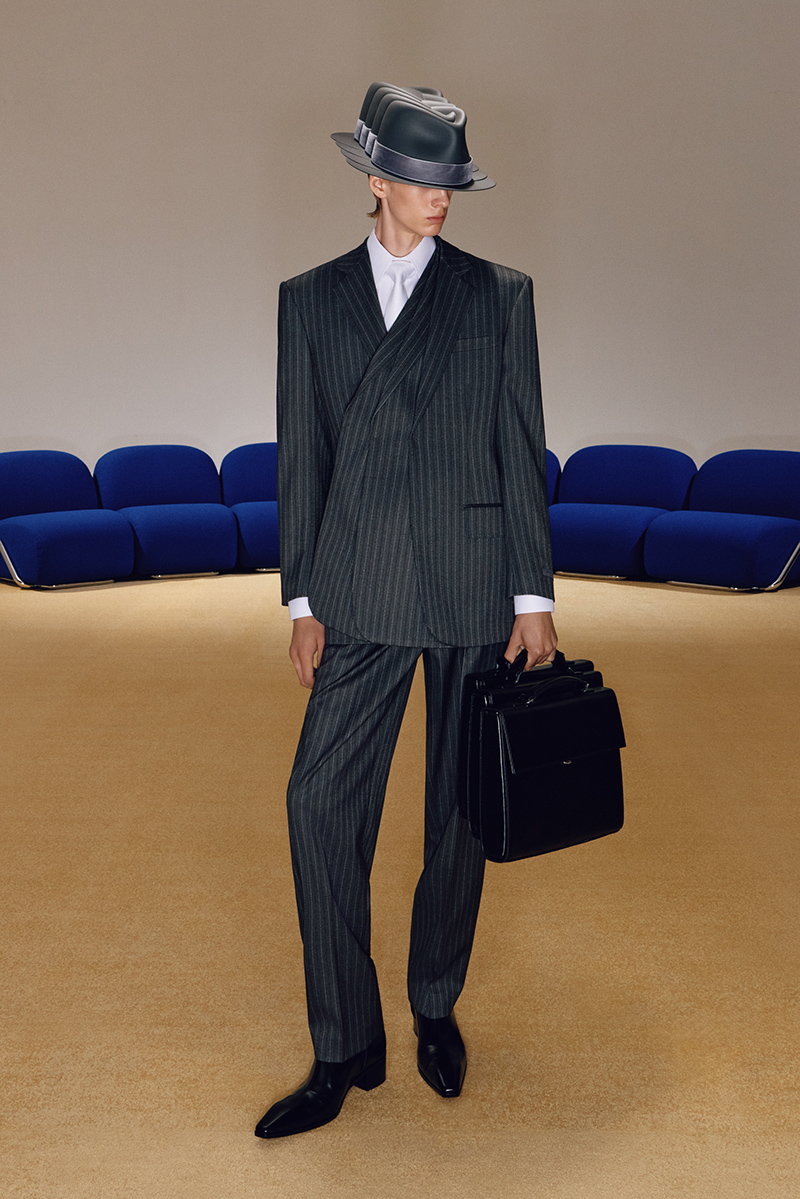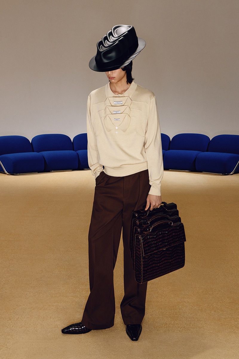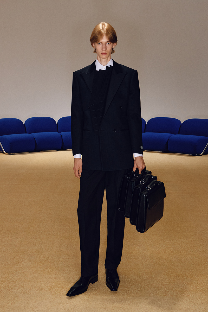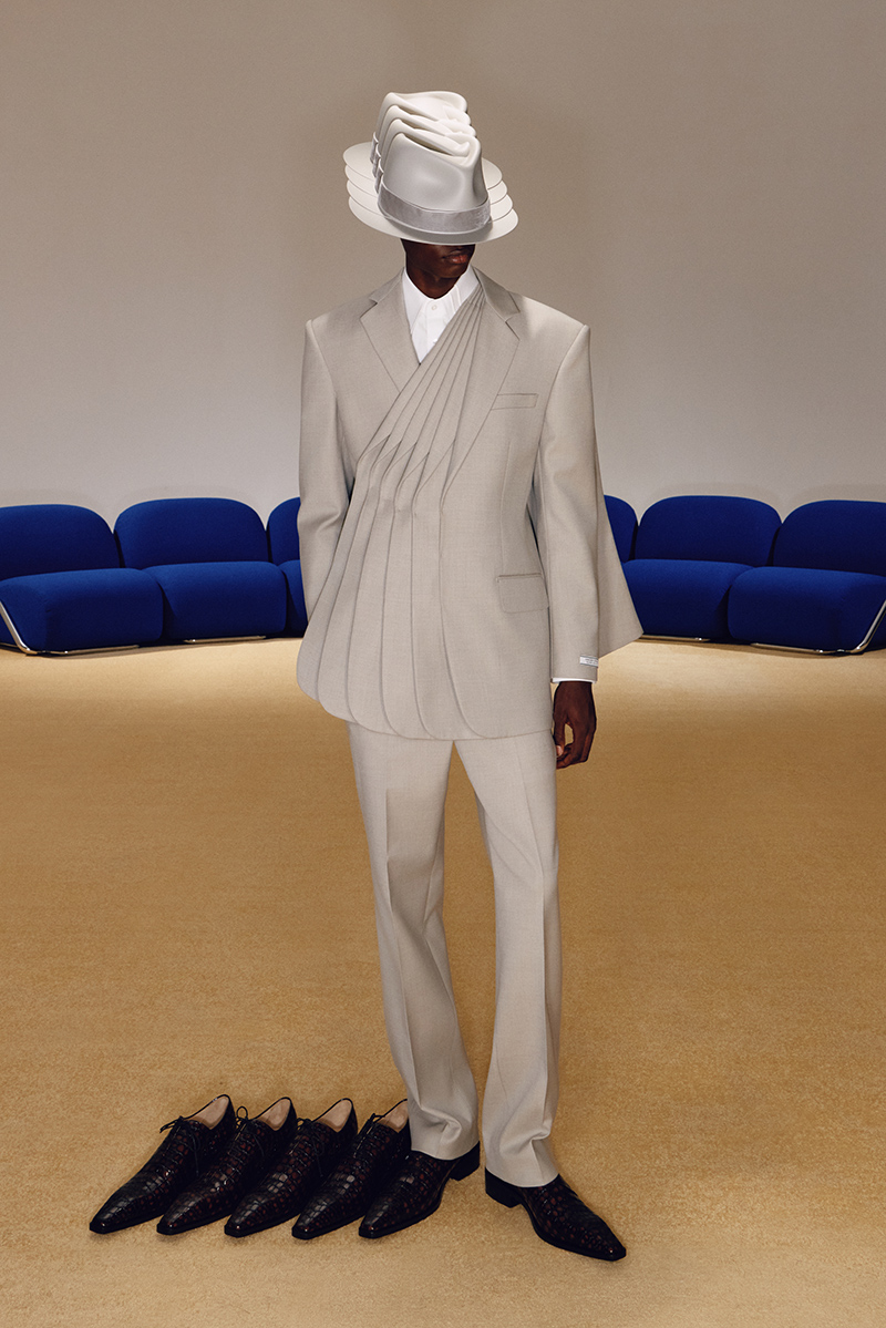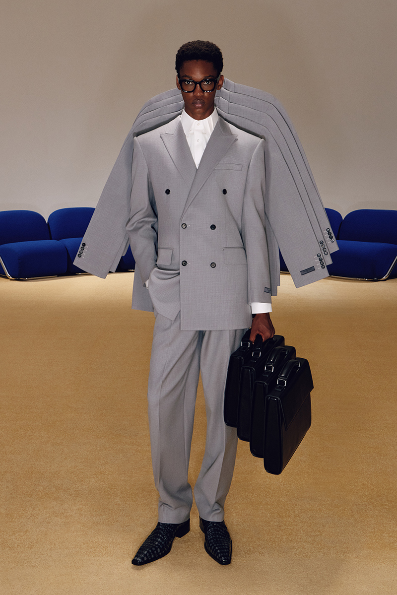 If past collections looked to astronauts and cosmic systems, this one looks at a parallel version of our own world. Here, the suit is the default interface assigned by a system. The recursive tailoring and extended accessories make people look like social identities stuck in an infinite loading loop.