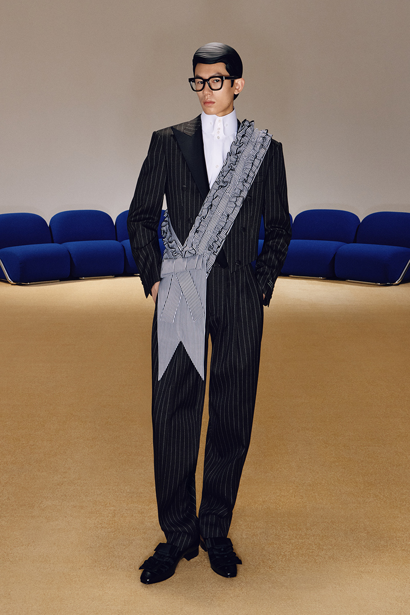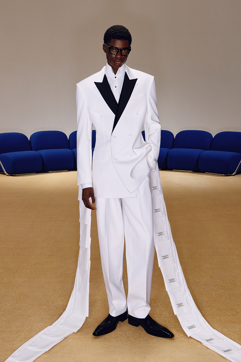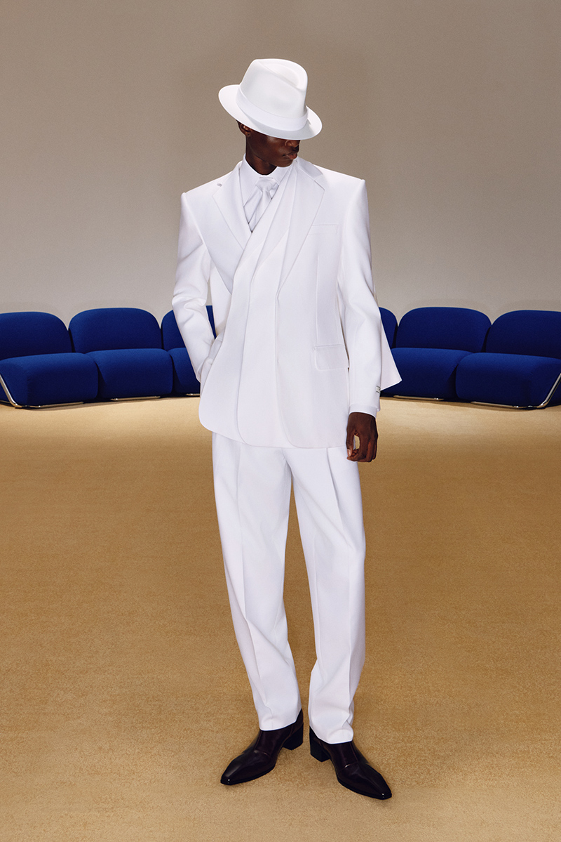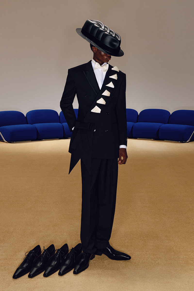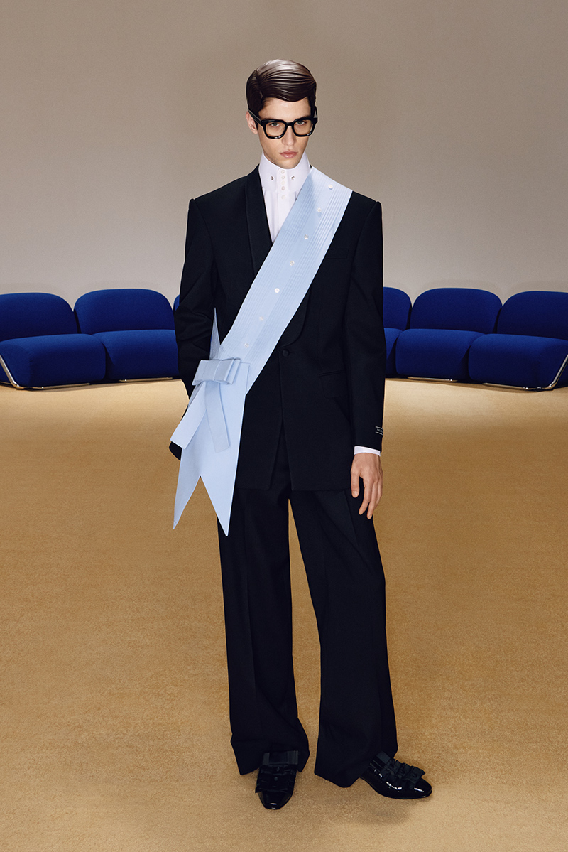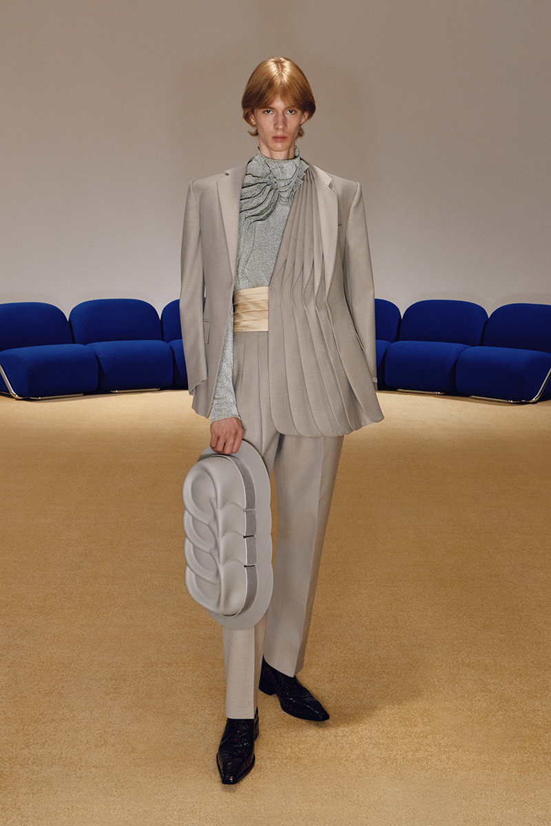 If past collections looked to astronauts and cosmic systems, this one looks at a parallel version of our own world. Here, the suit is the default interface assigned by a system. The recursive tailoring and extended accessories make people look like social identities stuck in an infinite loading loop.