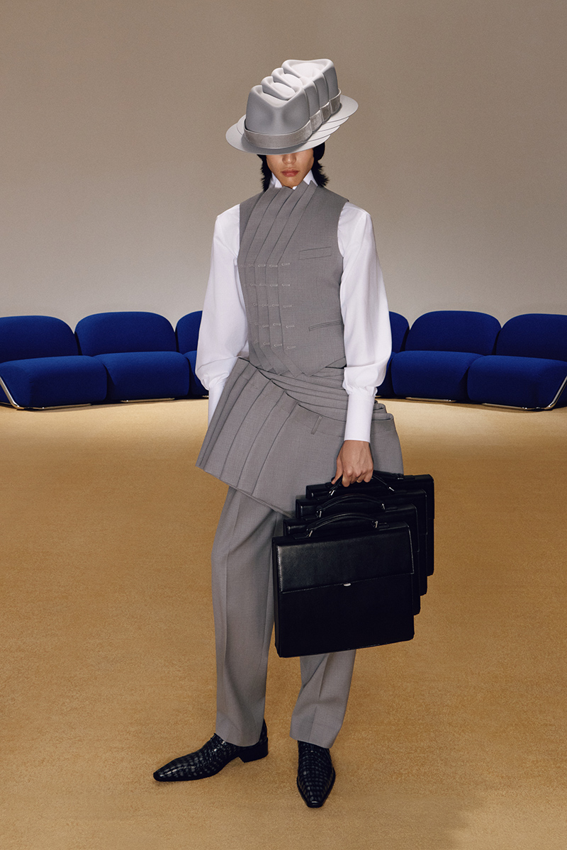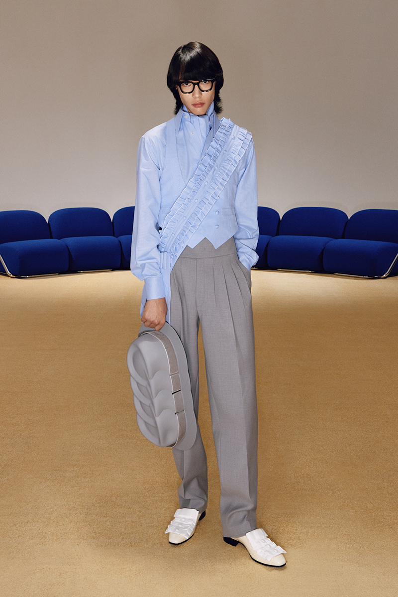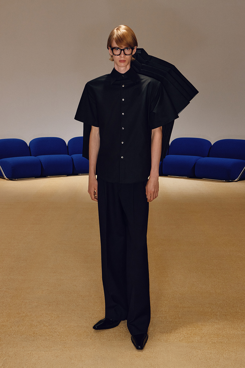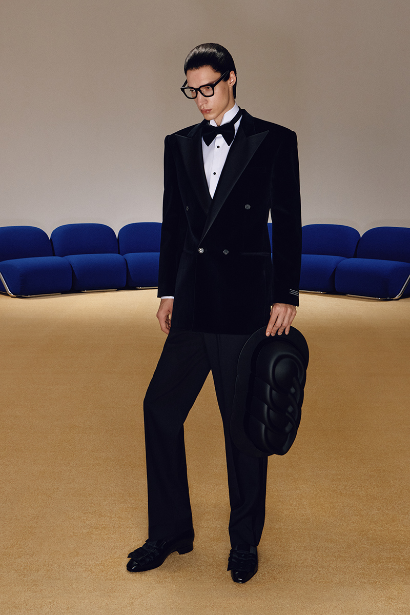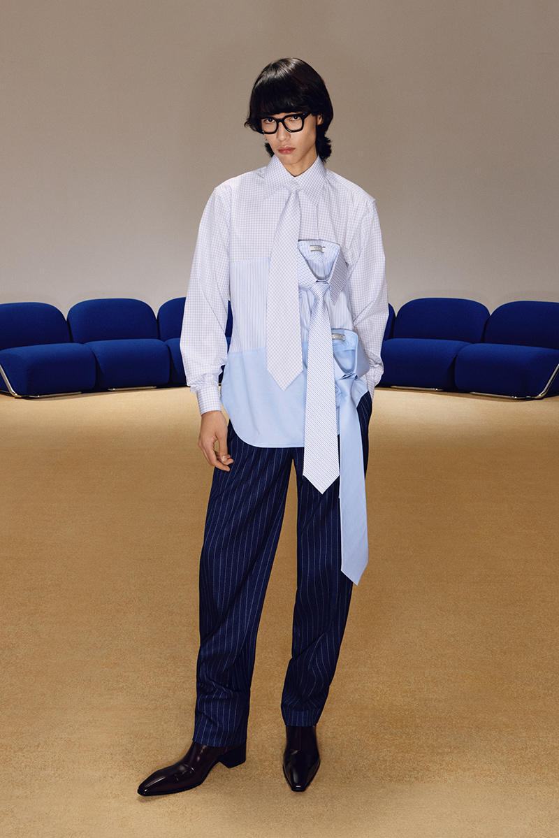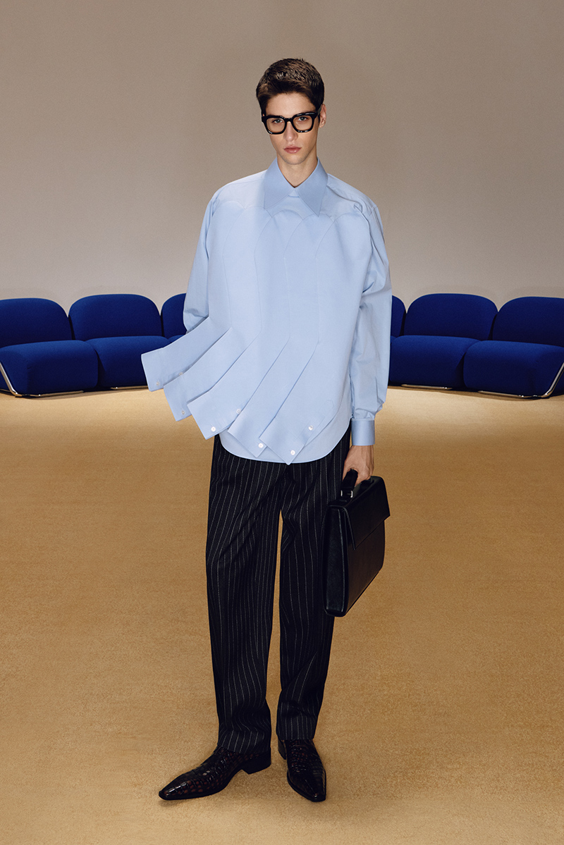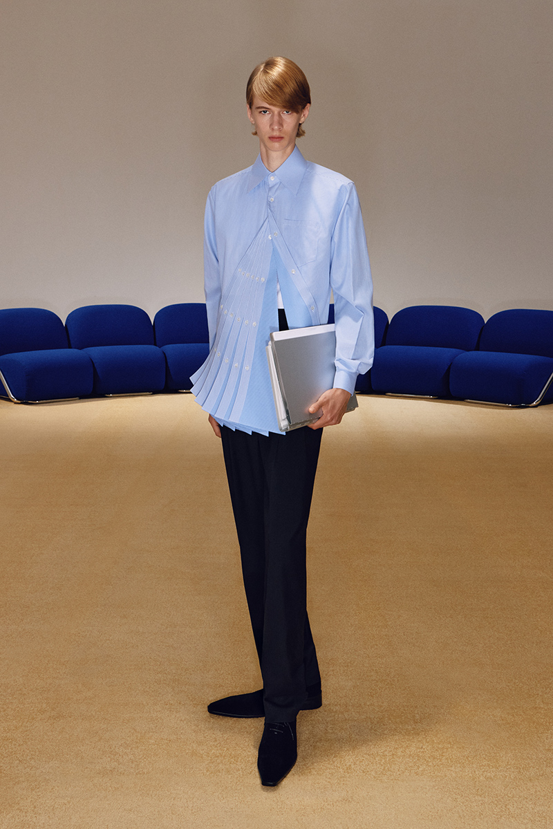 If past collections looked to astronauts and cosmic systems, this one looks at a parallel version of our own world. Here, the suit is the default interface assigned by a system. The recursive tailoring and extended accessories make people look like social identities stuck in an infinite loading loop.