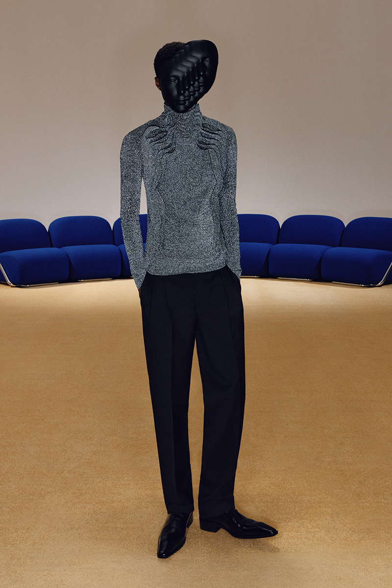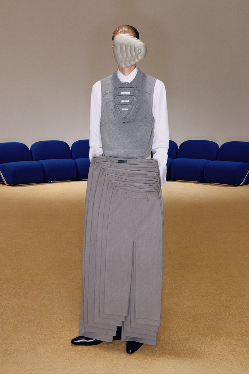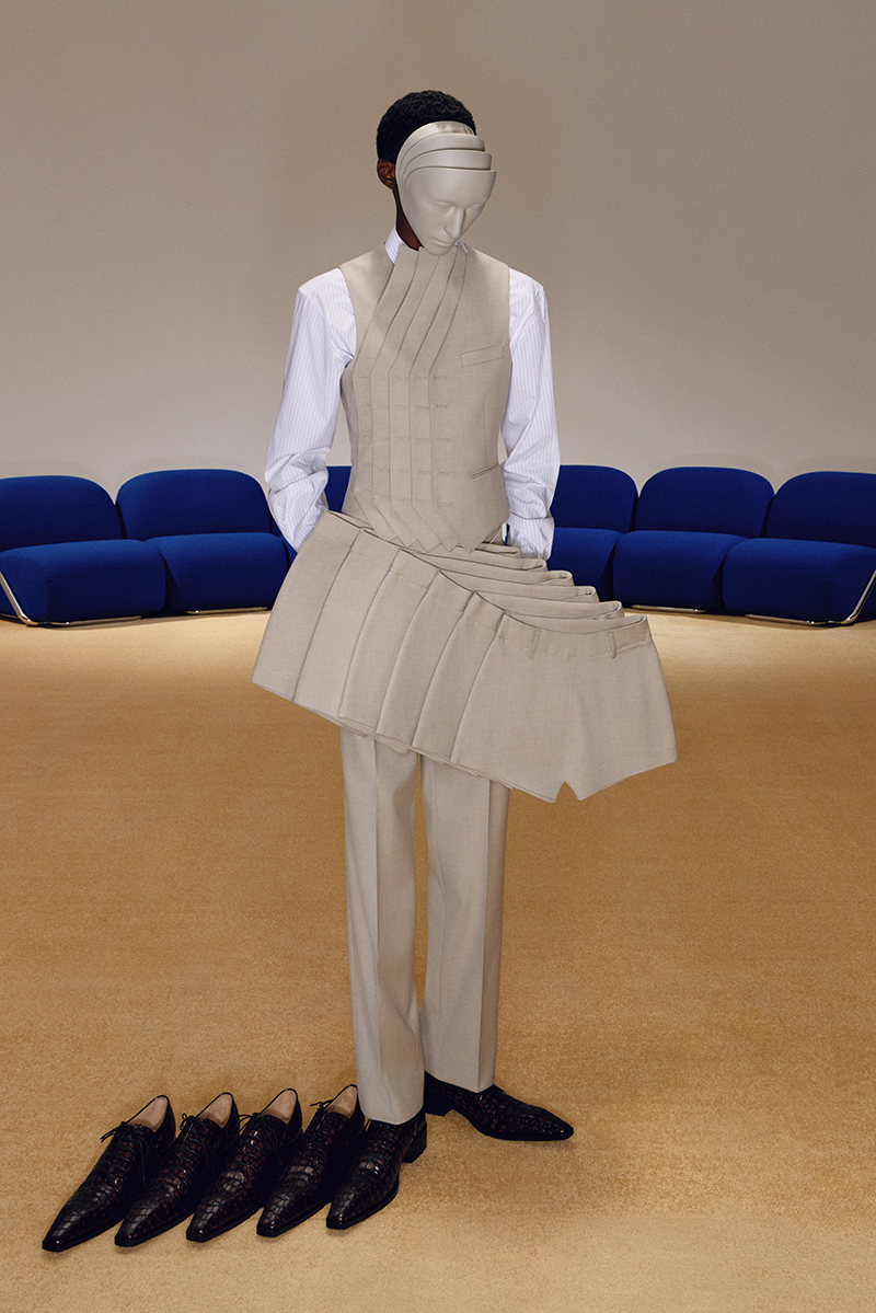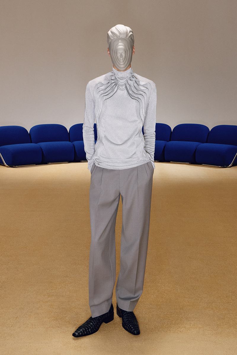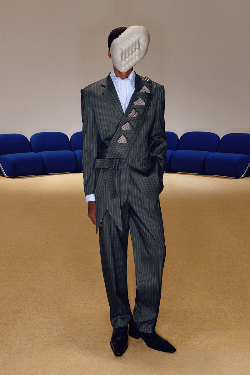 The materials are classic but used in new ways. Multiple panels are layered, creating tension between drape and structure. Stripes are multiplied until they distort. This is not a joke. It is a serious inquiry into how power and order might look in a future world. There are no technological gadgets here. The futuristic feeling is built entirely through tailoring and craft. The show’s setting is deliberately plain: a beige carpet, standard blue chairs, a conference room from a near future. The models’ faces are hidden by abstract masks.