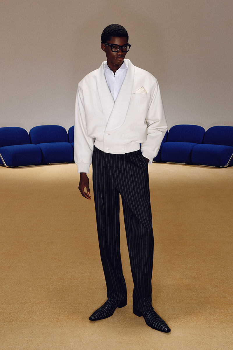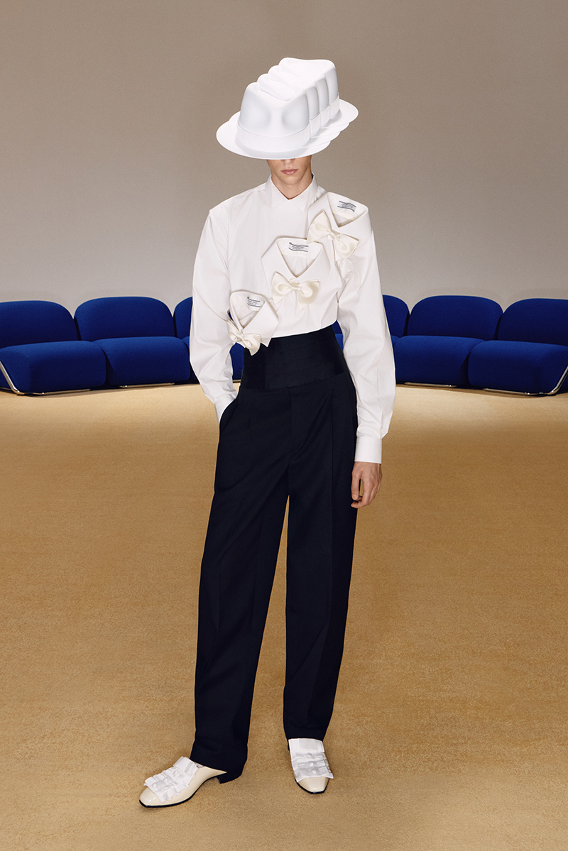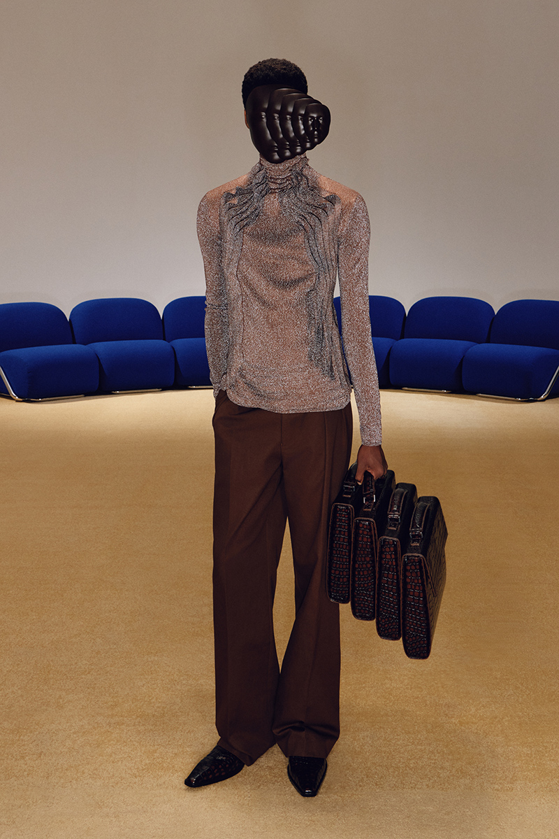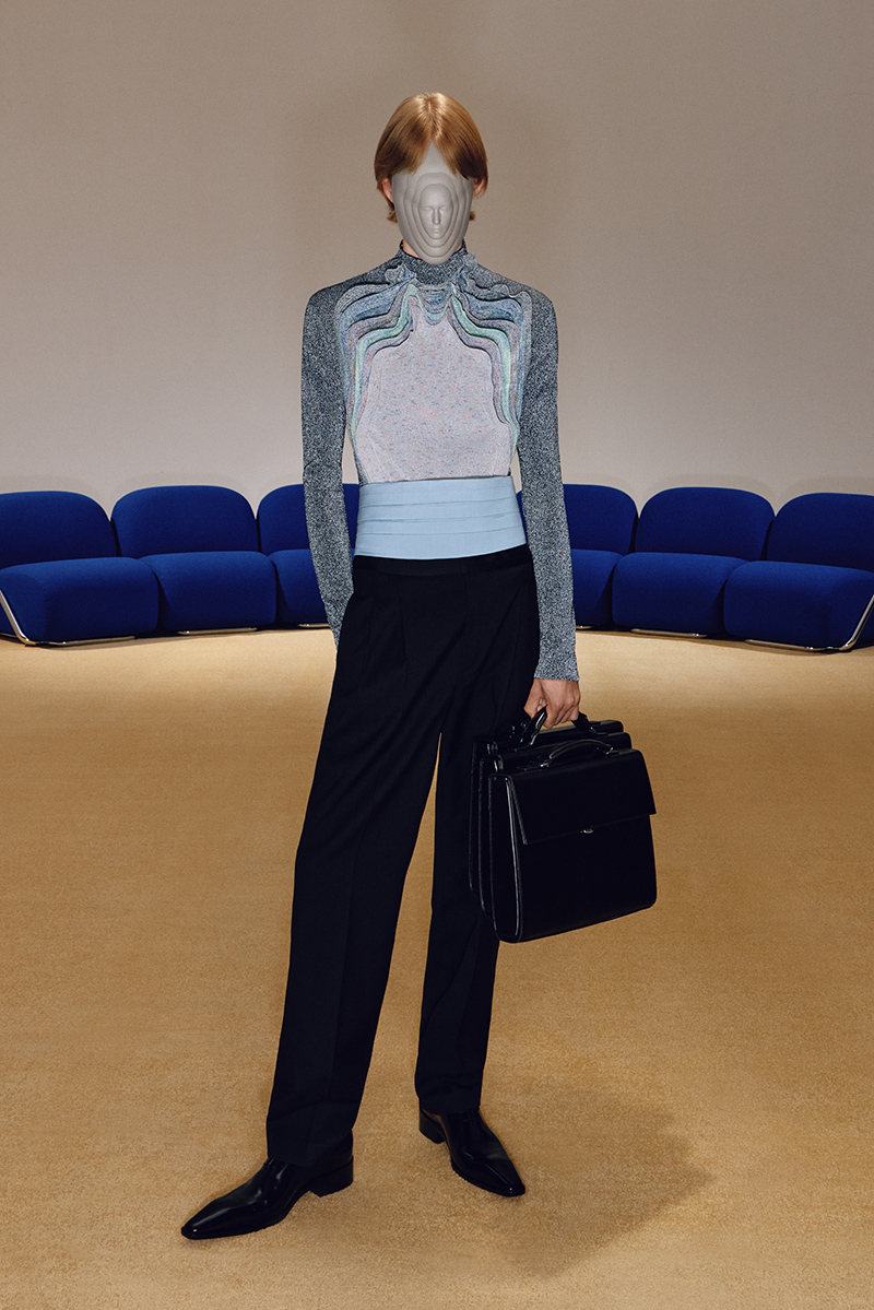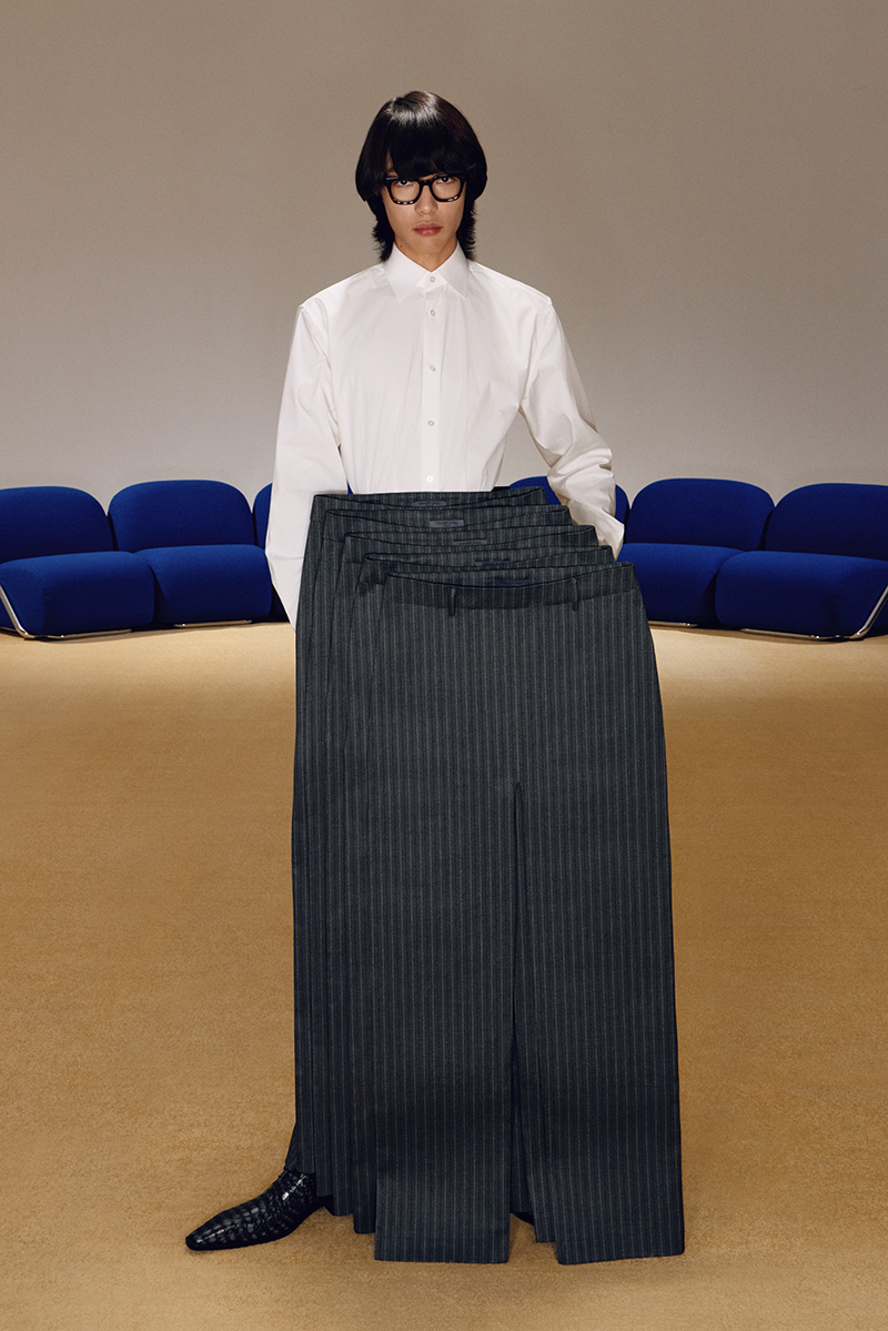 The materials are classic but used in new ways. Multiple panels are layered, creating tension between drape and structure. Stripes are multiplied until they distort. This is not a joke. It is a serious inquiry into how power and order might look in a future world. There are no technological gadgets here. The futuristic feeling is built entirely through tailoring and craft. The show’s setting is deliberately plain: a beige carpet, standard blue chairs, a conference room from a near future. The models’ faces are hidden by abstract masks.