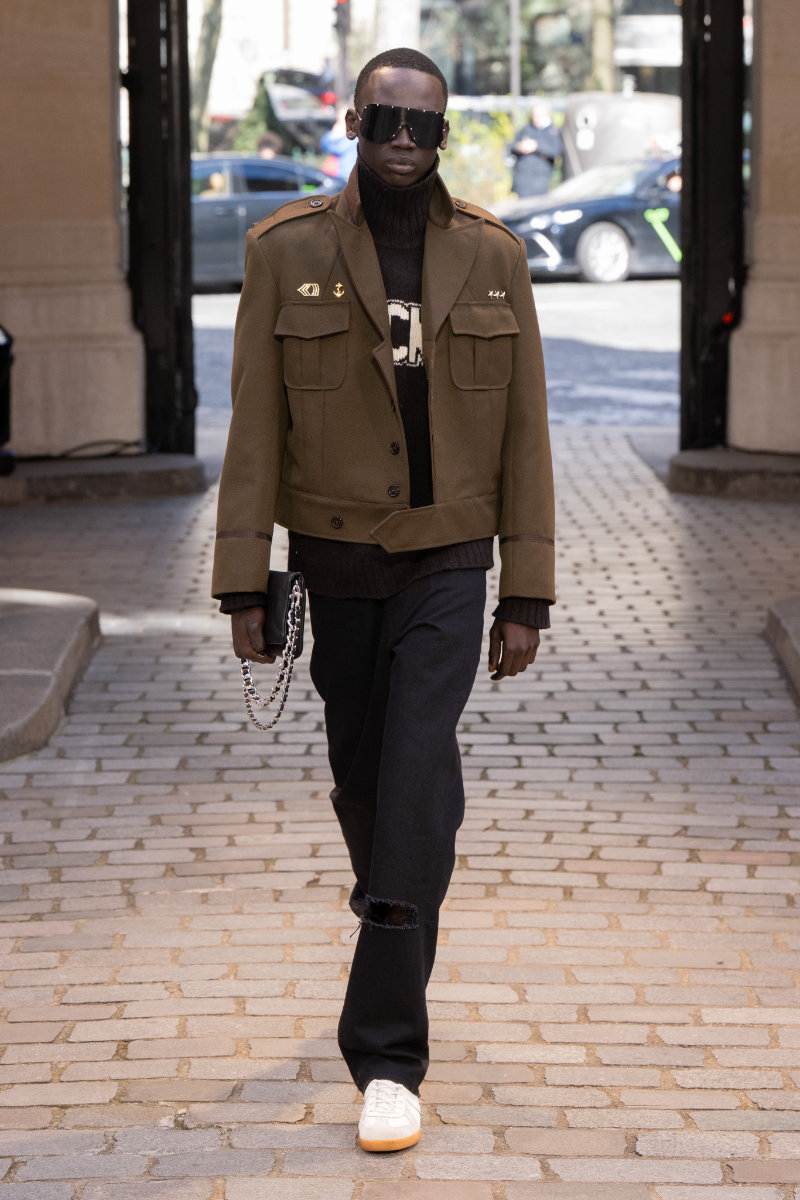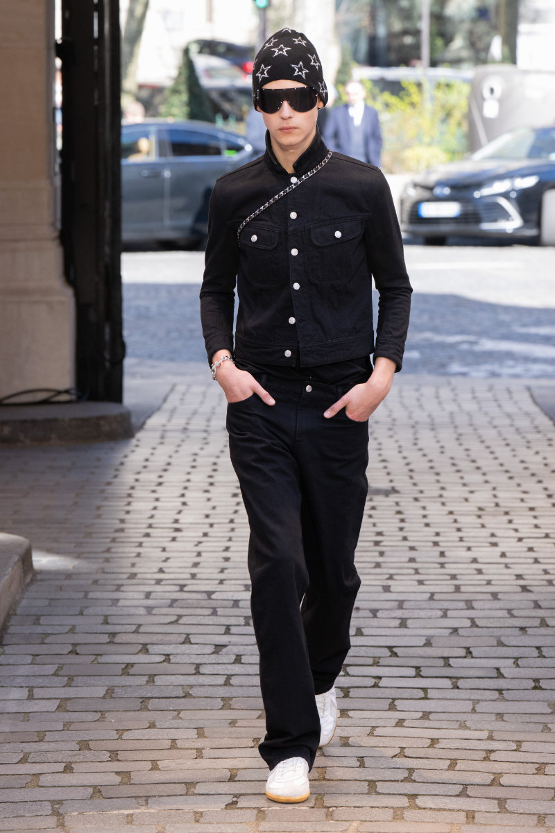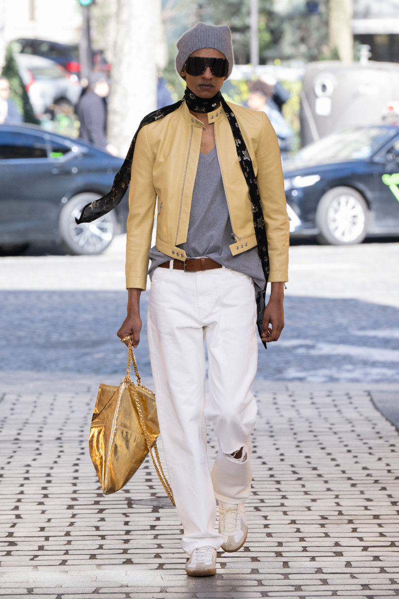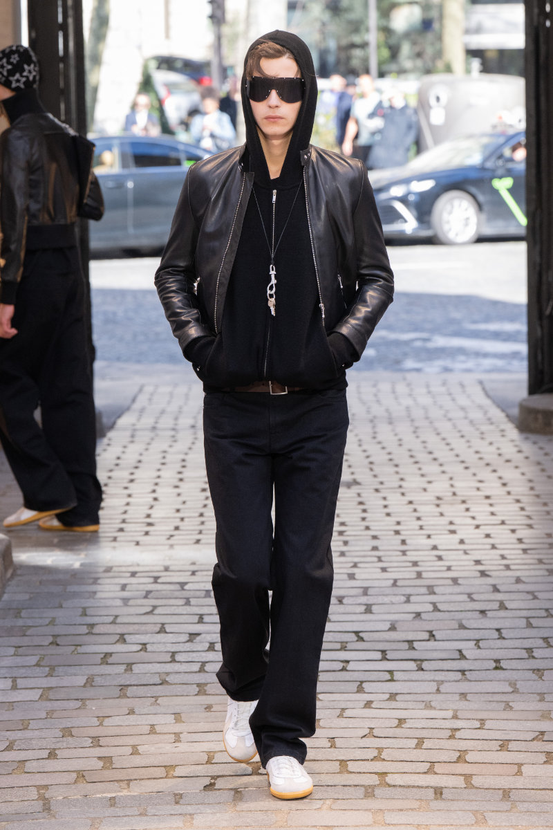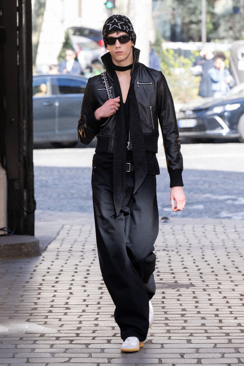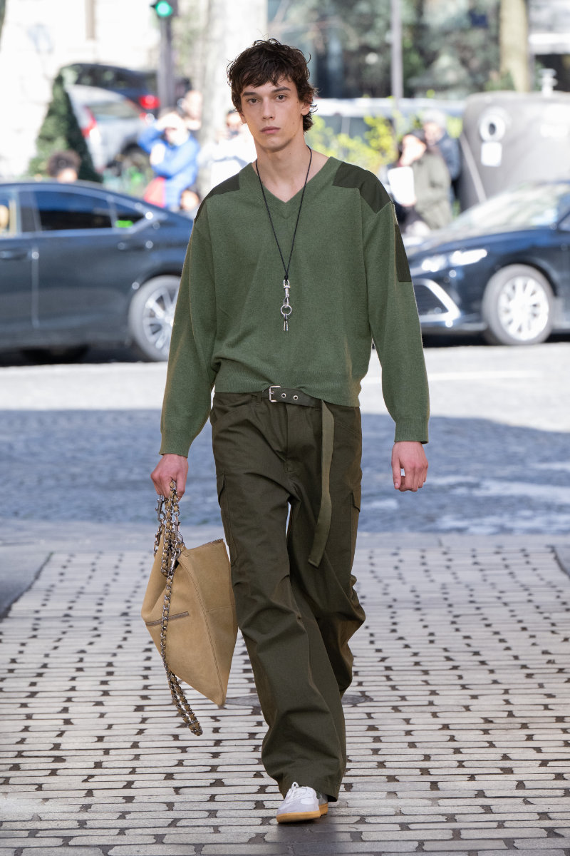 Leather, long a staple of the brand’s DNA, made bags a highlight; men with simple sweaters brought the party to life with high energy and big bags. These had metal eyelets and long chains swinging and shining to the beat. The looks featured “Z&D” buckle belts, pants with rock silhouettes, cropped jackets, vests, leather, and denim. New creative director Dan Sablon brought sharpness to the runway in his first collection.